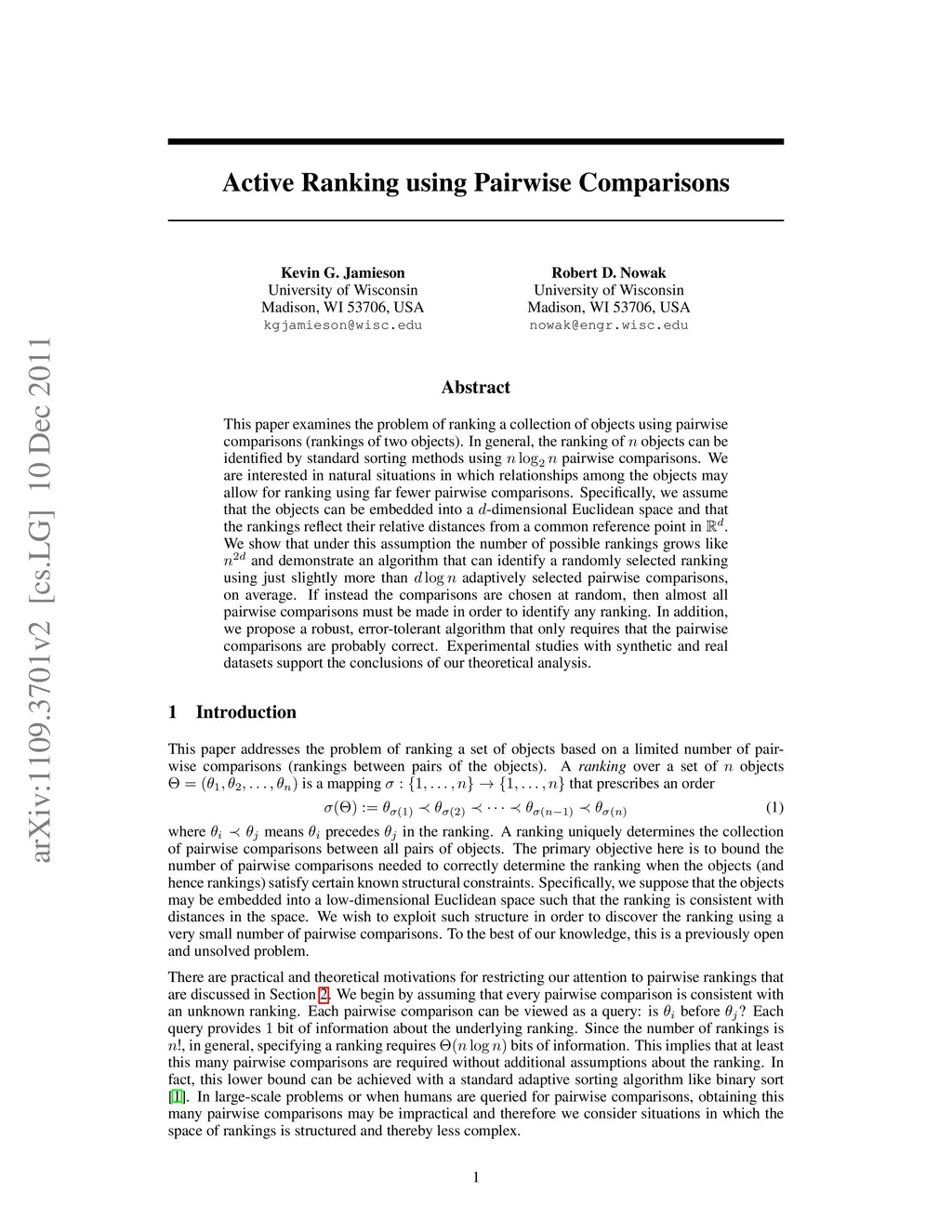 This paper examines the problem of ranking a collection of objects using pairwise comparisons (rankings of two objects). In general, the ranking of objects can be identified by standard sorting methods using pairwise comparisons. We are interested in natural situations in which relationships among the objects may allow for ranking using far fewer pairwise comparisons. Specifically, we assume that the objects can be embedded into a -dimensional Euclidean space and that the rankings reflect their relative distances from a common reference point in . We show that under this assumption the number of possible rankings grows like and demonstrate an algorithm that can identify a randomly selected ranking using just slightly more than adaptively selected pairwise comparisons, on average. If instead the comparisons are chosen at random, then almost all pairwise comparisons must be made in order to identify any ranking. In addition, we propose a robust, error-tolerant algorithm that only requires that the pairwise comparisons are probably correct. Experimental studies with synthetic and real datasets support the conclusions of our theoretical analysis.