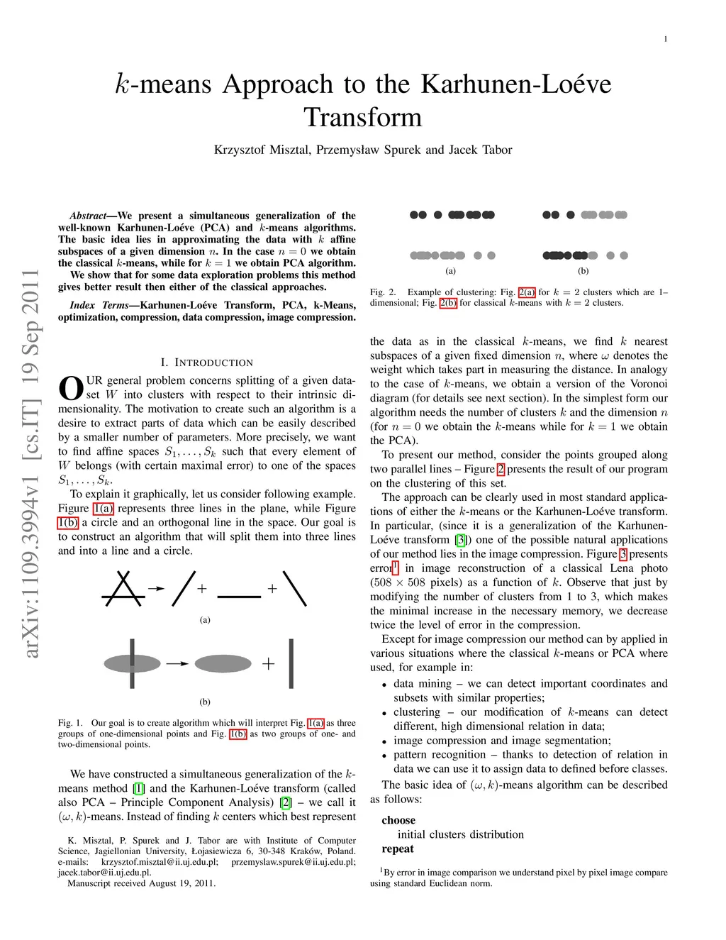 We present a simultaneous generalization of the well-known Karhunen-Loeve (PCA) and k-means algorithms. The basic idea lies in approximating the data with k affine subspaces of a given dimension n. In the case n=0 we obtain the classical k-means, while for k=1 we obtain PCA algorithm. We show that for some data exploration problems this method gives better result then either of the classical approaches.