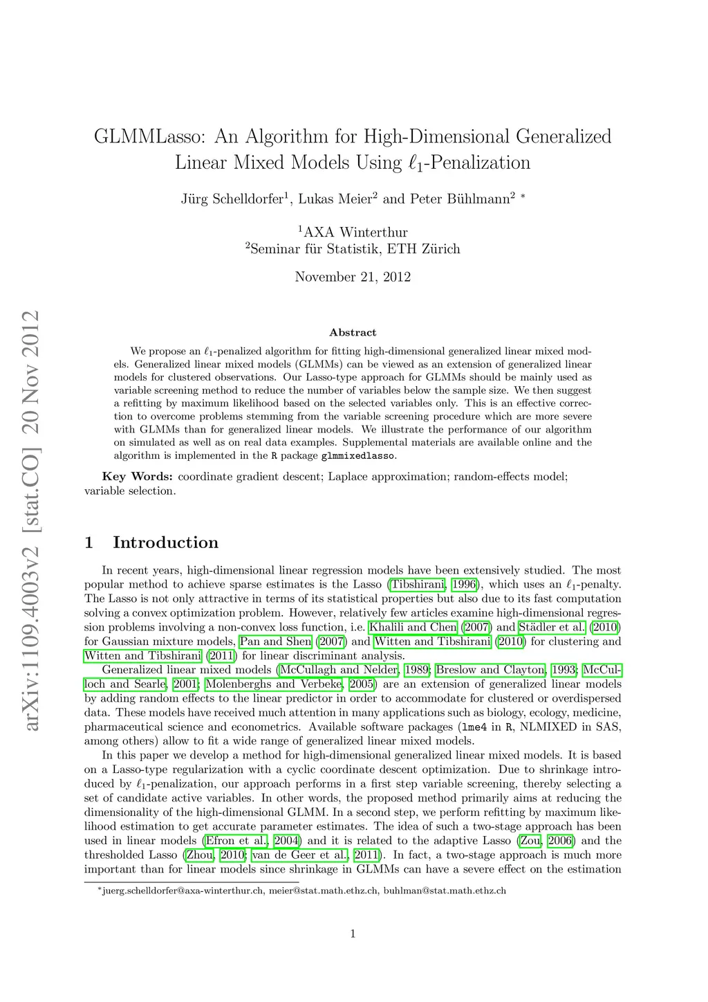 We propose an L1-penalized algorithm for fitting high-dimensional generalized linear mixed models. Generalized linear mixed models (GLMMs) can be viewed as an extension of generalized linear models for clustered observations. This Lasso-type approach for GLMMs should be mainly used as variable screening method to reduce the number of variables below the sample size. We then suggest a refitting by maximum likelihood based on the selected variables only. This is an effective correction to overcome problems stemming from the variable screening procedure which are more severe with GLMMs. We illustrate the performance of our algorithm on simulated as well as on real data examples. Supplemental materials are available online and the algorithm is implemented in the R package glmmixedlasso.