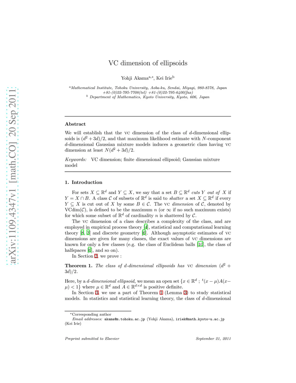 We will establish that the VC dimension of the class of d-dimensional ellipsoids is (d^2+3d)/2, and that maximum likelihood estimate with N-component d-dimensional Gaussian mixture models induces a geometric class having VC dimension at least N(d^2+3d)/2. Keywords: VC dimension; finite dimensional ellipsoid; Gaussian mixture model