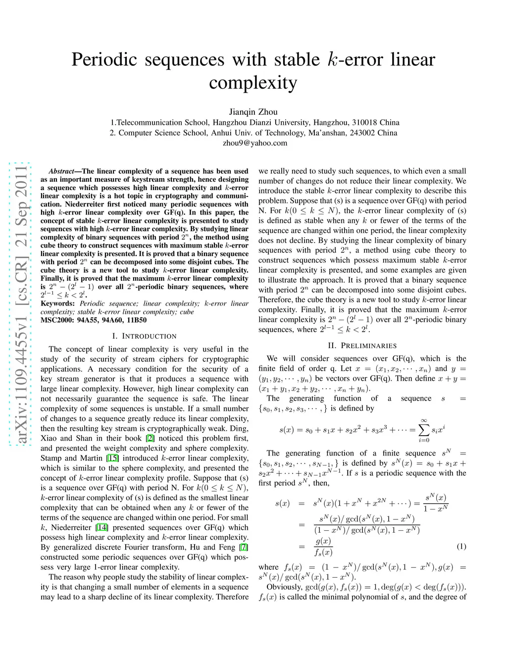 The linear complexity of a sequence has been used as an important measure of keystream strength, hence designing a sequence which possesses high linear complexity and -error linear complexity is a hot topic in cryptography and communication. Niederreiter first noticed many periodic sequences with high -error linear complexity over GF(q). In this paper, the concept of stable -error linear complexity is presented to study sequences with high -error linear complexity. By studying linear complexity of binary sequences with period , the method using cube theory to construct sequences with maximum stable -error linear complexity is presented. It is proved that a binary sequence with period can be decomposed into some disjoint cubes. The cube theory is a new tool to study -error linear complexity. Finally, it is proved that the maximum -error linear complexity is over all -periodic binary sequences, where .