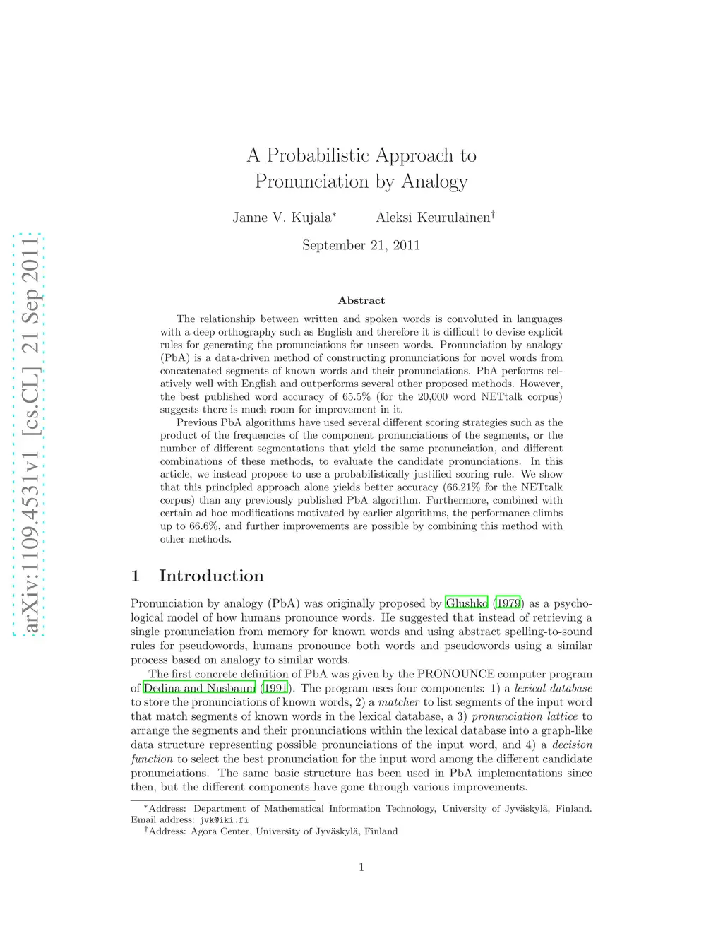 The relationship between written and spoken words is convoluted in languages with a deep orthography such as English and therefore it is difficult to devise explicit rules for generating the pronunciations for unseen words. Pronunciation by analogy (PbA) is a data-driven method of constructing pronunciations for novel words from concatenated segments of known words and their pronunciations. PbA performs relatively well with English and outperforms several other proposed methods. However, the best published word accuracy of 65.5% (for the 20,000 word NETtalk corpus) suggests there is much room for improvement in it. Previous PbA algorithms have used several different scoring strategies such as the product of the frequencies of the component pronunciations of the segments, or the number of different segmentations that yield the same pronunciation, and different combinations of these methods, to evaluate the candidate pronunciations. In this article, we instead propose to use a probabilistically justified scoring rule. We show that this principled approach alone yields better accuracy (66.21% for the NETtalk corpus) than any previously published PbA algorithm. Furthermore, combined with certain ad hoc modifications motivated by earlier algorithms, the performance climbs up to 66.6%, and further improvements are possible by combining this method with other methods.