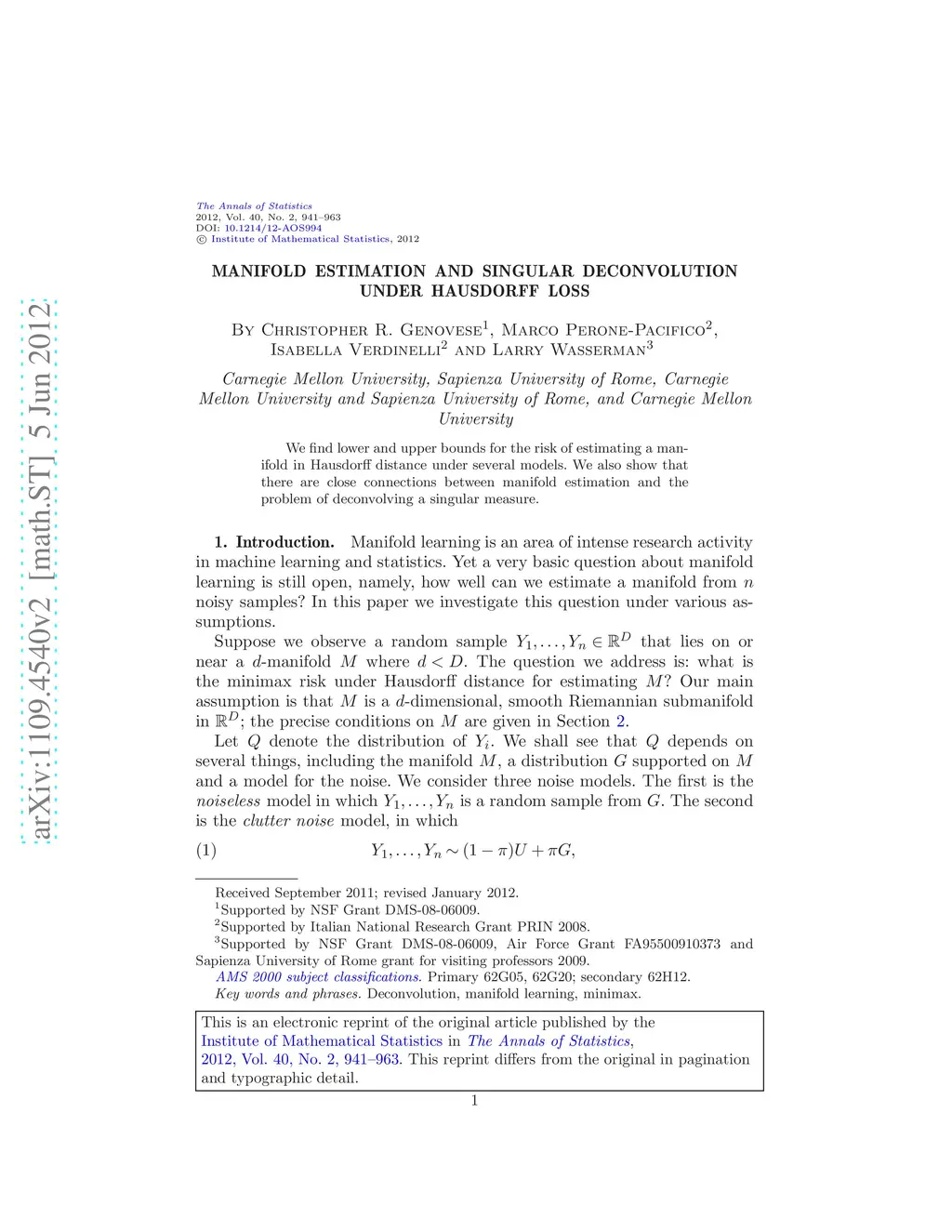 We find lower and upper bounds for the risk of estimating a manifold in Hausdorff distance under several models. We also show that there are close connections between manifold estimation and the problem of deconvolving a singular measure.