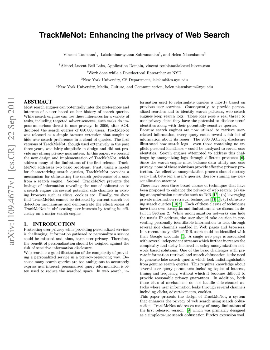 Most search engines can potentially infer the preferences and interests of a user based on her history of search queries. While search engines can use these inferences for a variety of tasks, including targeted advertisements, such tasks do impose an serious threat to user privacy. In 2006, after AOL disclosed the search queries of 650,000 users, TrackMeNot was released as a simple browser extension that sought to hide user search preferences in a cloud of queries. The first versions of TrackMeNot, though used extensively in the past three years, was fairly simplistic in design and did not provide any strong privacy guarantees. In this paper, we present the new design and implementation of TrackMeNot, which address many of the limitations of the first release. TrackMeNot addresses two basic problems. First, using a model for characterizing search queries, TrackMeNot provides a mechanism for obfuscating the search preferences of a user from a search engine. Second, TrackMeNot prevents the leakage of information revealing the use of obfuscation to a search engine via several potential side channels in existing browsers such as clicks, cookies etc. Finally, we show that TrackMeNot cannot be detected by current search bot detection mechanisms and demonstrate the effectiveness of TrackMeNot in obfuscating user interests by testing its efficiency on a major search engine.