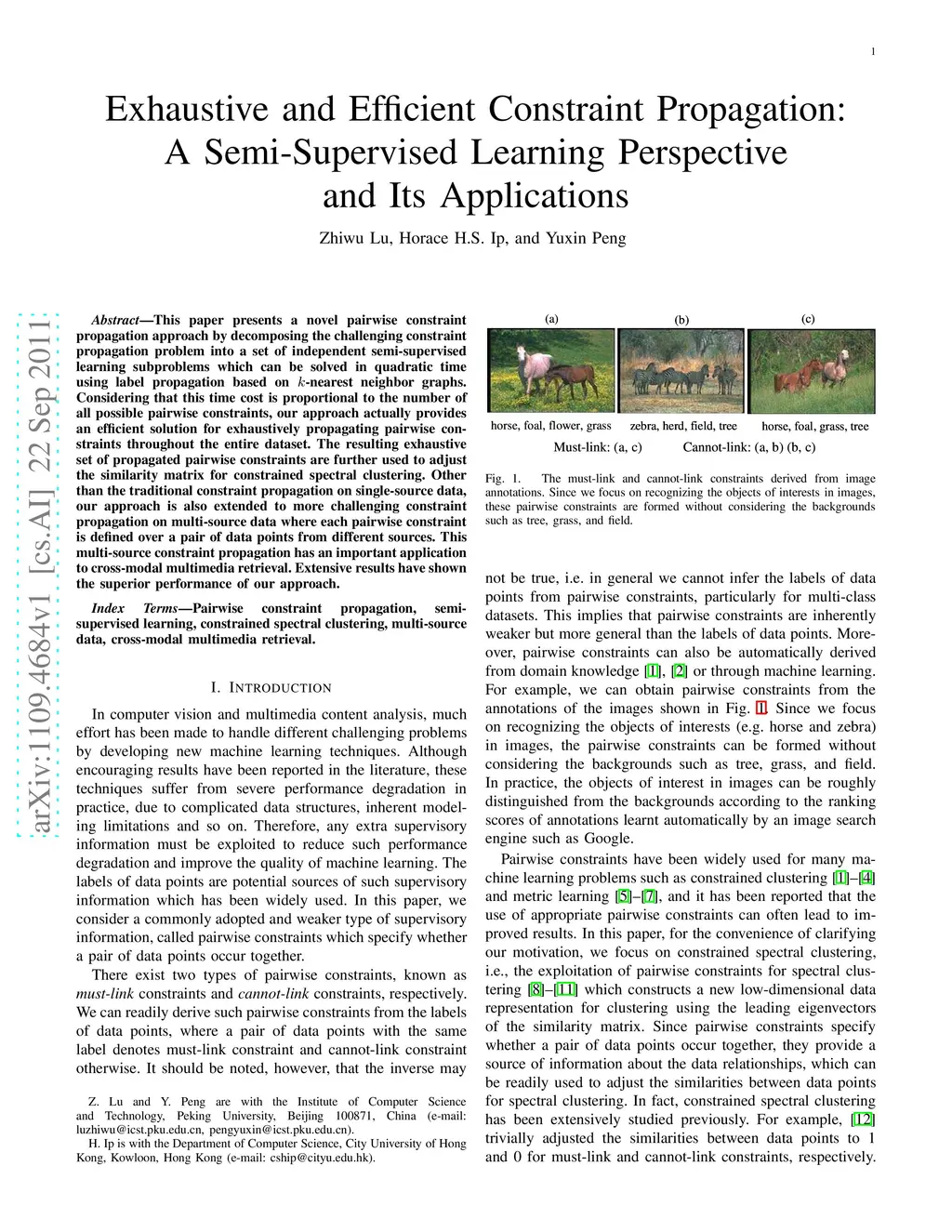 This paper presents a novel pairwise constraint propagation approach by decomposing the challenging constraint propagation problem into a set of independent semi-supervised learning subproblems which can be solved in quadratic time using label propagation based on k-nearest neighbor graphs. Considering that this time cost is proportional to the number of all possible pairwise constraints, our approach actually provides an efficient solution for exhaustively propagating pairwise constraints throughout the entire dataset. The resulting exhaustive set of propagated pairwise constraints are further used to adjust the similarity matrix for constrained spectral clustering. Other than the traditional constraint propagation on single-source data, our approach is also extended to more challenging constraint propagation on multi-source data where each pairwise constraint is defined over a pair of data points from different sources. This multi-source constraint propagation has an important application to cross-modal multimedia retrieval. Extensive results have shown the superior performance of our approach.