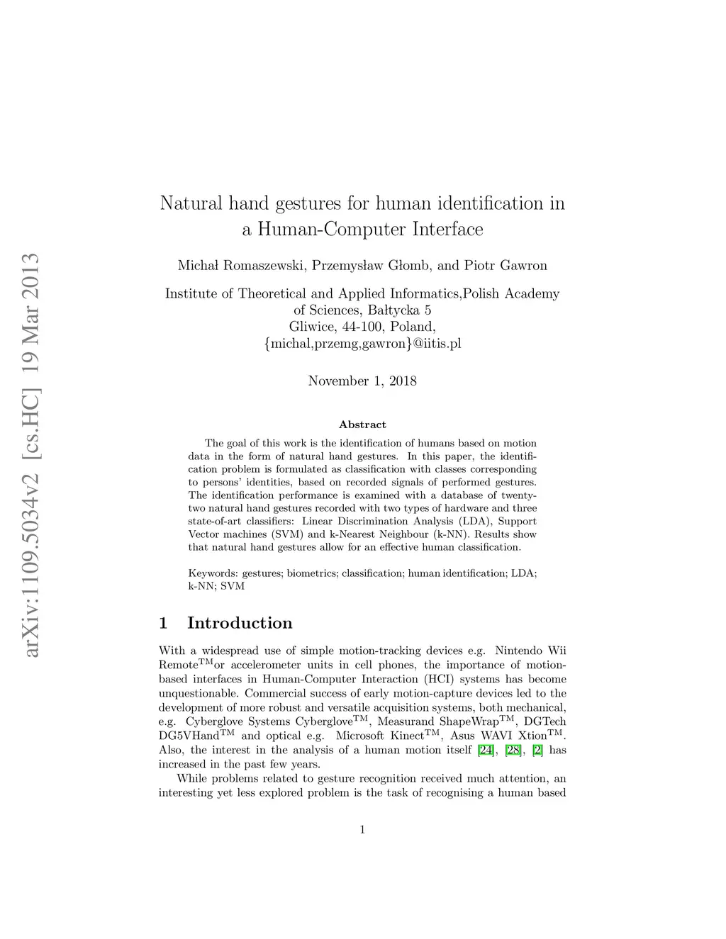 Natural hand gestures for human identification in a Human-Computer