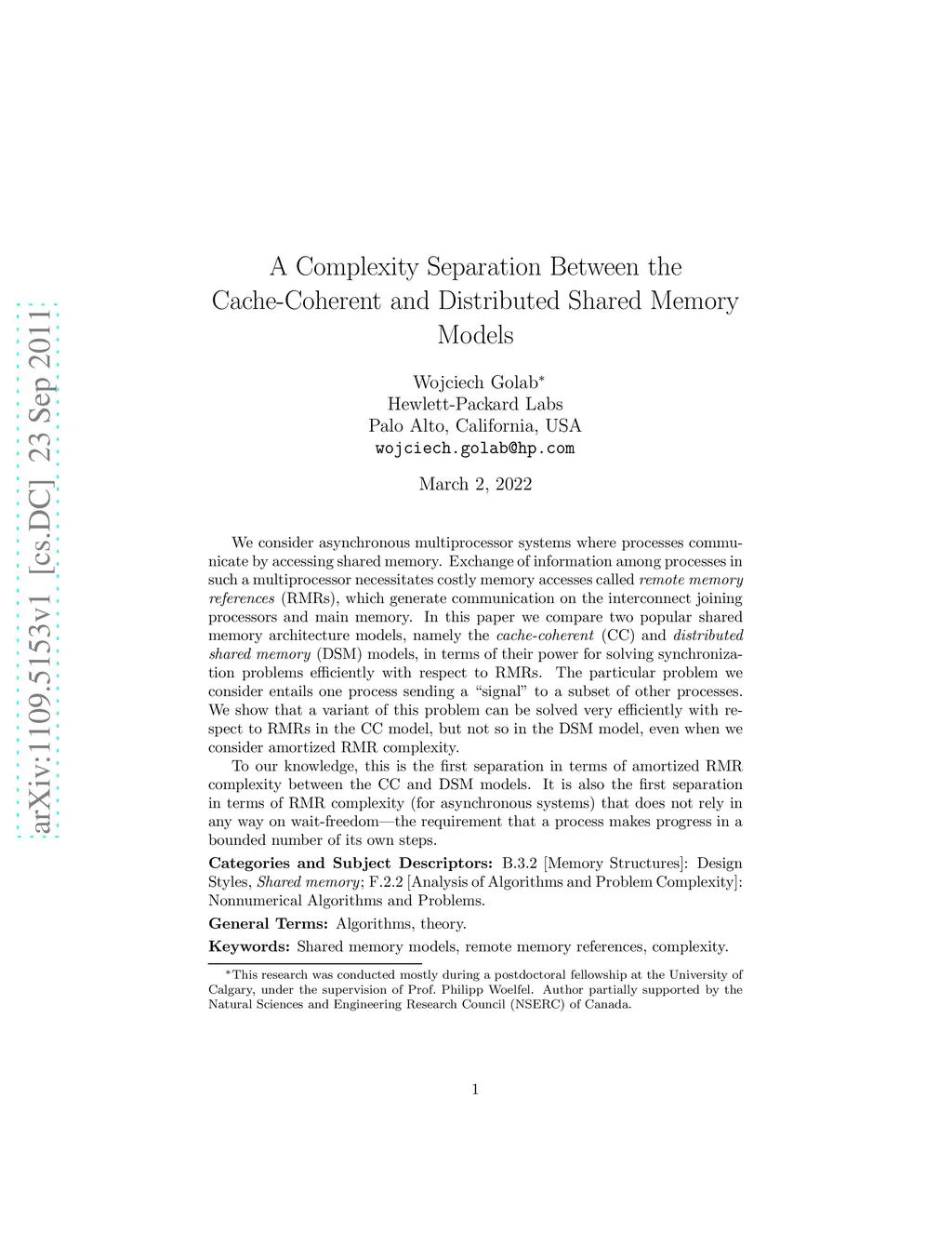 We consider asynchronous multiprocessor systems where processes communicate by accessing shared memory. Exchange of information among processes in such a multiprocessor necessitates costly memory accesses called \emph{remote memory references} (RMRs), which generate communication on the interconnect joining processors and main memory. In this paper we compare two popular shared memory architecture models, namely the \emph{cache-coherent} (CC) and \emph{distributed shared memory} (DSM) models, in terms of their power for solving synchronization problems efficiently with respect to RMRs. The particular problem we consider entails one process sending a "signal" to a subset of other processes. We show that a variant of this problem can be solved very efficiently with respect to RMRs in the CC model, but not so in the DSM model, even when we consider amortized RMR complexity. To our knowledge, this is the first separation in terms of amortized RMR complexity between the CC and DSM models. It is also the first separation in terms of RMR complexity (for asynchronous systems) that does not rely in any way on wait-freedom---the requirement that a process makes progress in a bounded number of its own steps.