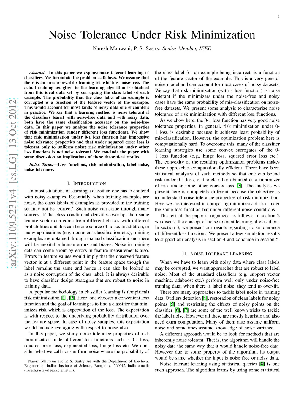 In this paper we explore noise tolerant learning of classifiers. We formulate the problem as follows. We assume that there is an training set which is noise-free. The actual training set given to the learning algorithm is obtained from this ideal data set by corrupting the class label of each example. The probability that the class label of an example is corrupted is a function of the feature vector of the example. This would account for most kinds of noisy data one encounters in practice. We say that a learning method is noise tolerant if the classifiers learnt with the ideal noise-free data and with noisy data, both have the same classification accuracy on the noise-free data. In this paper we analyze the noise tolerance properties of risk minimization (under different loss functions), which is a generic method for learning classifiers. We show that risk minimization under 0-1 loss function has impressive noise tolerance properties and that under squared error loss is tolerant only to uniform noise; risk minimization under other loss functions is not noise tolerant. We conclude the paper with some discussion on implications of these theoretical results.