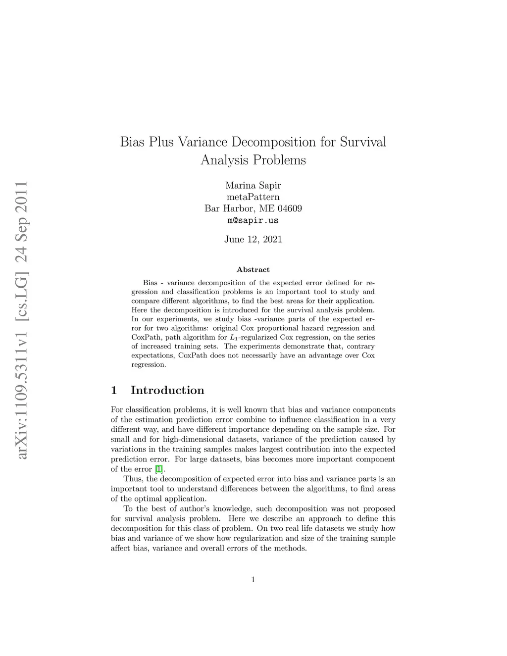 Bias - variance decomposition of the expected error defined for regression and classification problems is an important tool to study and compare different algorithms, to find the best areas for their application. Here the decomposition is introduced for the survival analysis problem. In our experiments, we study bias -variance parts of the expected error for two algorithms: original Cox proportional hazard regression and CoxPath, path algorithm for L1-regularized Cox regression, on the series of increased training sets. The experiments demonstrate that, contrary expectations, CoxPath does not necessarily have an advantage over Cox regression.