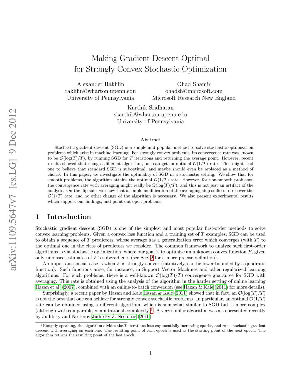 Stochastic gradient descent (SGD) is a simple and popular method to solve stochastic optimization problems which arise in machine learning. For strongly convex problems, its convergence rate was known to be O(\log(T)/T), by running SGD for T iterations and returning the average point. However, recent results showed that using a different algorithm, one can get an optimal O(1/T) rate. This might lead one to believe that standard SGD is suboptimal, and maybe should even be replaced as a method of choice. In this paper, we investigate the optimality of SGD in a stochastic setting. We show that for smooth problems, the algorithm attains the optimal O(1/T) rate. However, for non-smooth problems, the convergence rate with averaging might really be \Omega(\log(T)/T), and this is not just an artifact of the analysis. On the flip side, we show that a simple modification of the averaging step suffices to recover the O(1/T) rate, and no other change of the algorithm is necessary. We also present experimental results which support our findings, and point out open problems.