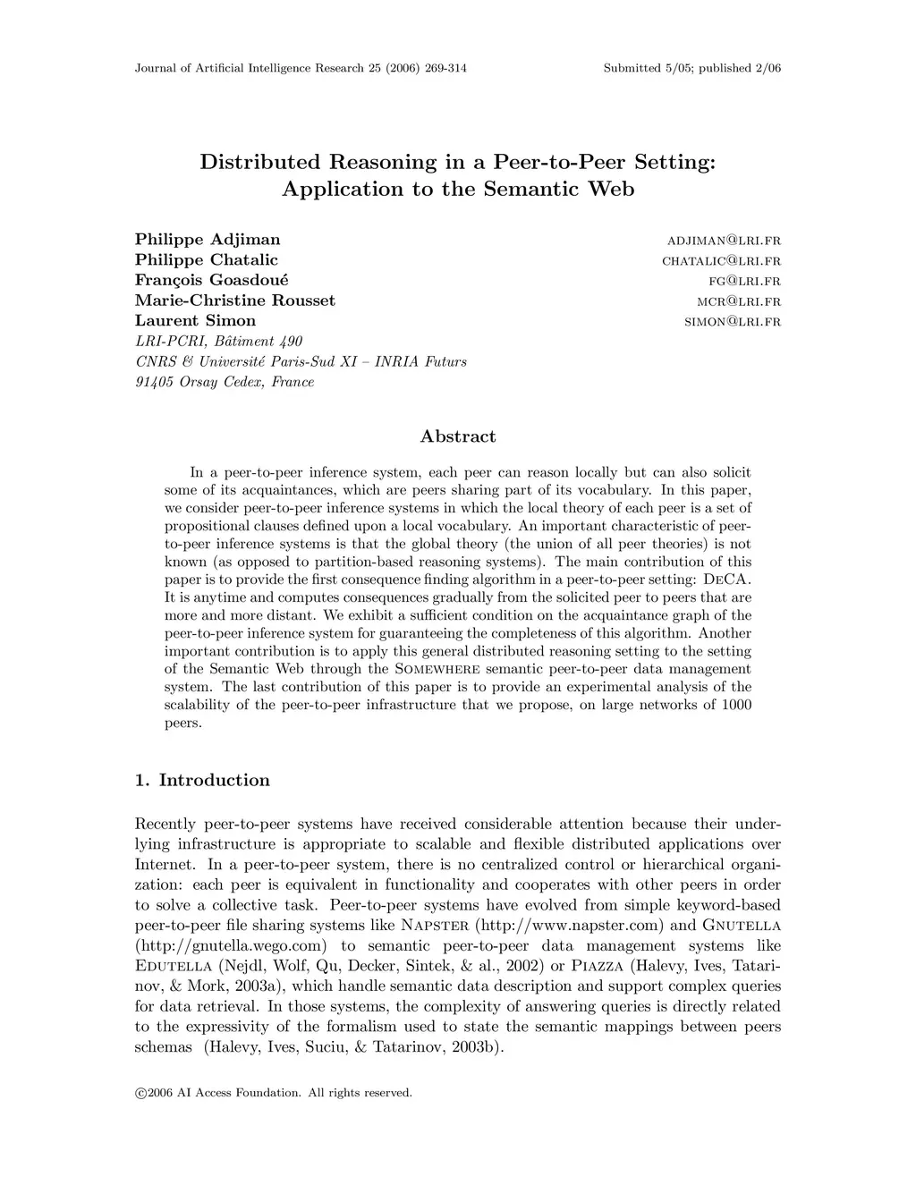 Distributed Reasoning in a Peer-to-Peer Setting: Application to the