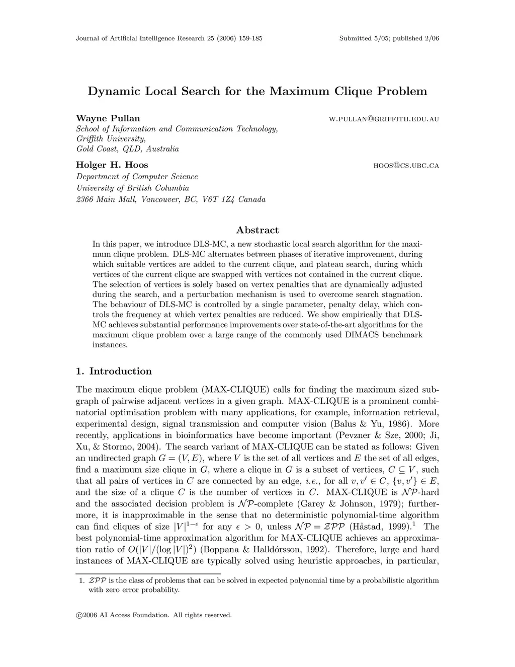 Dynamic Local Search for the Maximum Clique Problem