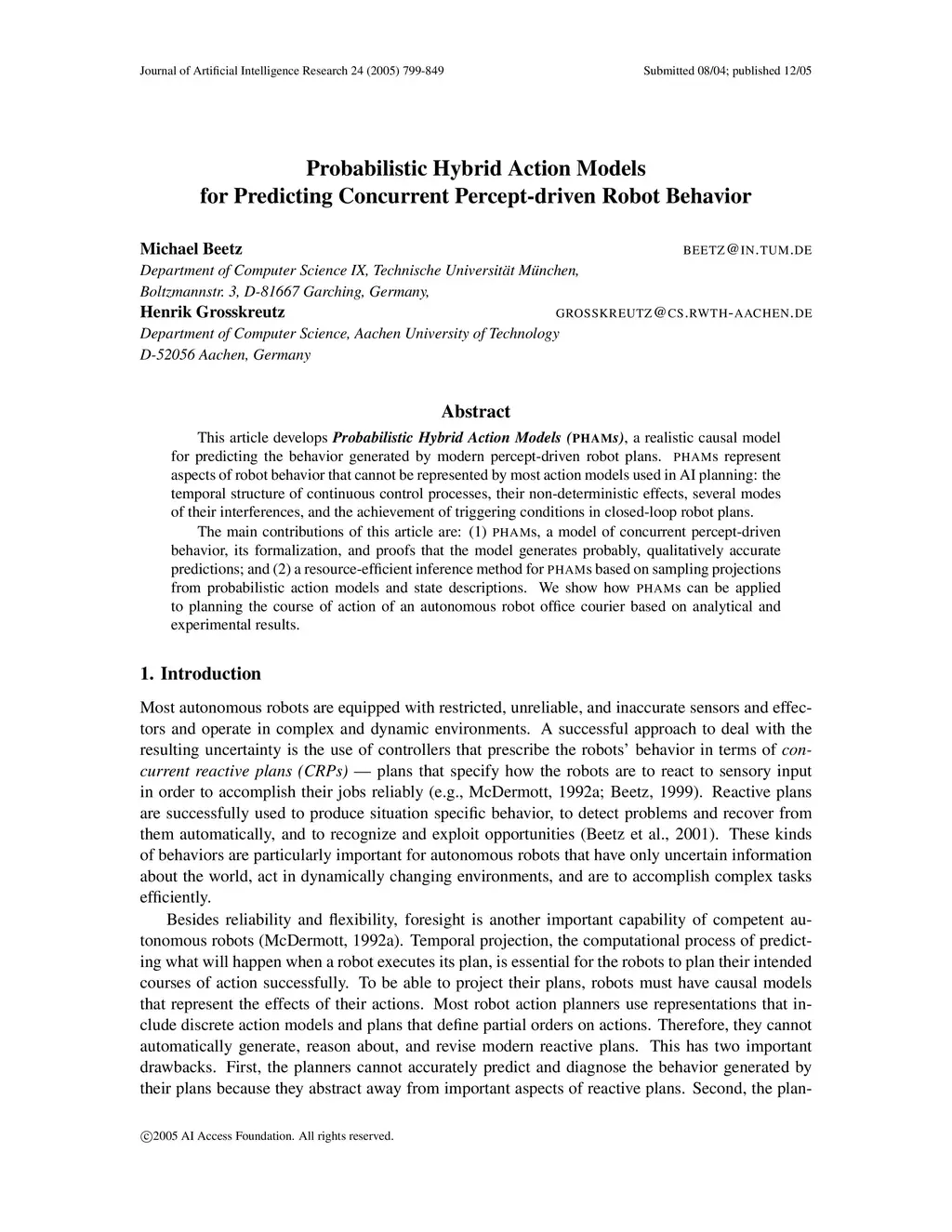 This article develops Probabilistic Hybrid Action Models (PHAMs), a realistic causal model for predicting the behavior generated by modern percept-driven robot plans. PHAMs represent aspects of robot behavior that cannot be represented by most action models used in AI planning: the temporal structure of continuous control processes, their non-deterministic effects, several modes of their interferences, and the achievement of triggering conditions in closed-loop robot plans. The main contributions of this article are: (1) PHAMs, a model of concurrent percept-driven behavior, its formalization, and proofs that the model generates probably, qualitatively accurate predictions; and (2) a resource-efficient inference method for PHAMs based on sampling projections from probabilistic action models and state descriptions. We show how PHAMs can be applied to planning the course of action of an autonomous robot office courier based on analytical and experimental results.