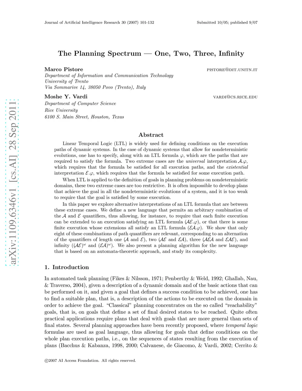 Linear Temporal Logic (LTL) is widely used for defining conditions on the execution paths of dynamic systems. In the case of dynamic systems that allow for nondeterministic evolutions, one has to specify, along with an LTL formula f, which are the paths that are required to satisfy the formula. Two extreme cases are the universal interpretation A.f, which requires that the formula be satisfied for all execution paths, and the existential interpretation E.f, which requires that the formula be satisfied for some execution path. When LTL is applied to the definition of goals in planning problems on nondeterministic domains, these two extreme cases are too restrictive. It is often impossible to develop plans that achieve the goal in all the nondeterministic evolutions of a system, and it is too weak to require that the goal is satisfied by some execution. In this paper we explore alternative interpretations of an LTL formula that are between these extreme cases. We define a new language that permits an arbitrary combination of the A and E quantifiers, thus allowing, for instance, to require that each finite execution can be extended to an execution satisfying an LTL formula (AE.f), or that there is some finite execution whose extensions all satisfy an LTL formula (EA.f). We show that only eight of these combinations of path quantifiers are relevant, corresponding to an alternation of the quantifiers of length one (A and E), two (AE and EA), three (AEA and EAE), and infinity ((AE)* and (EA)*). We also present a planning algorithm for the new language that is based on an automata-theoretic approach, and study its complexity.