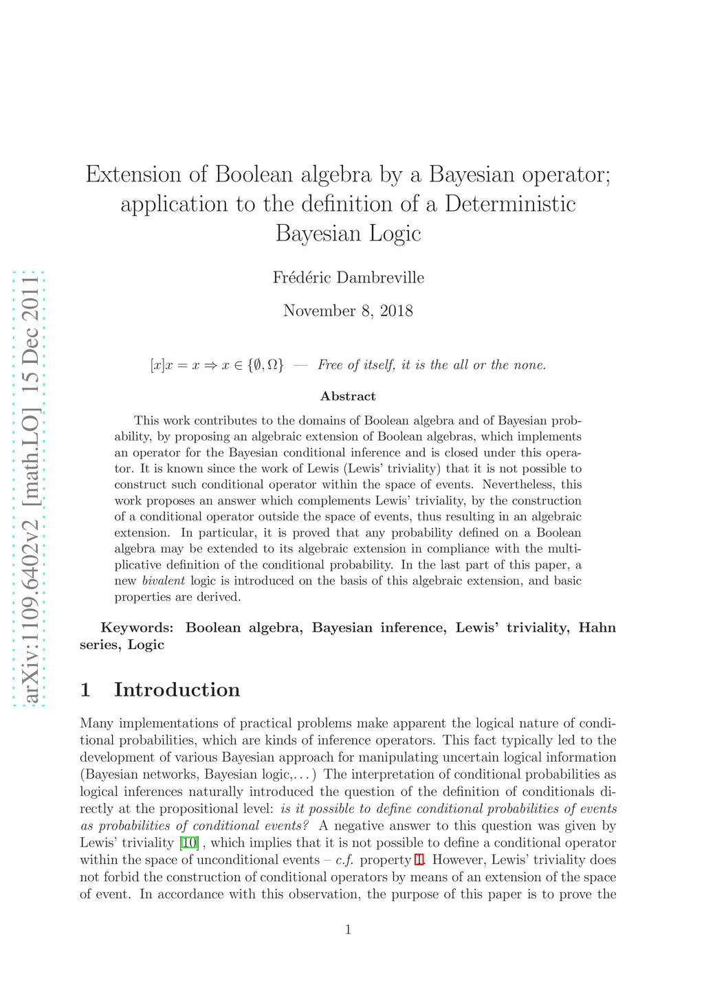 Extension of Boolean algebra by a Bayesian operator; application to the