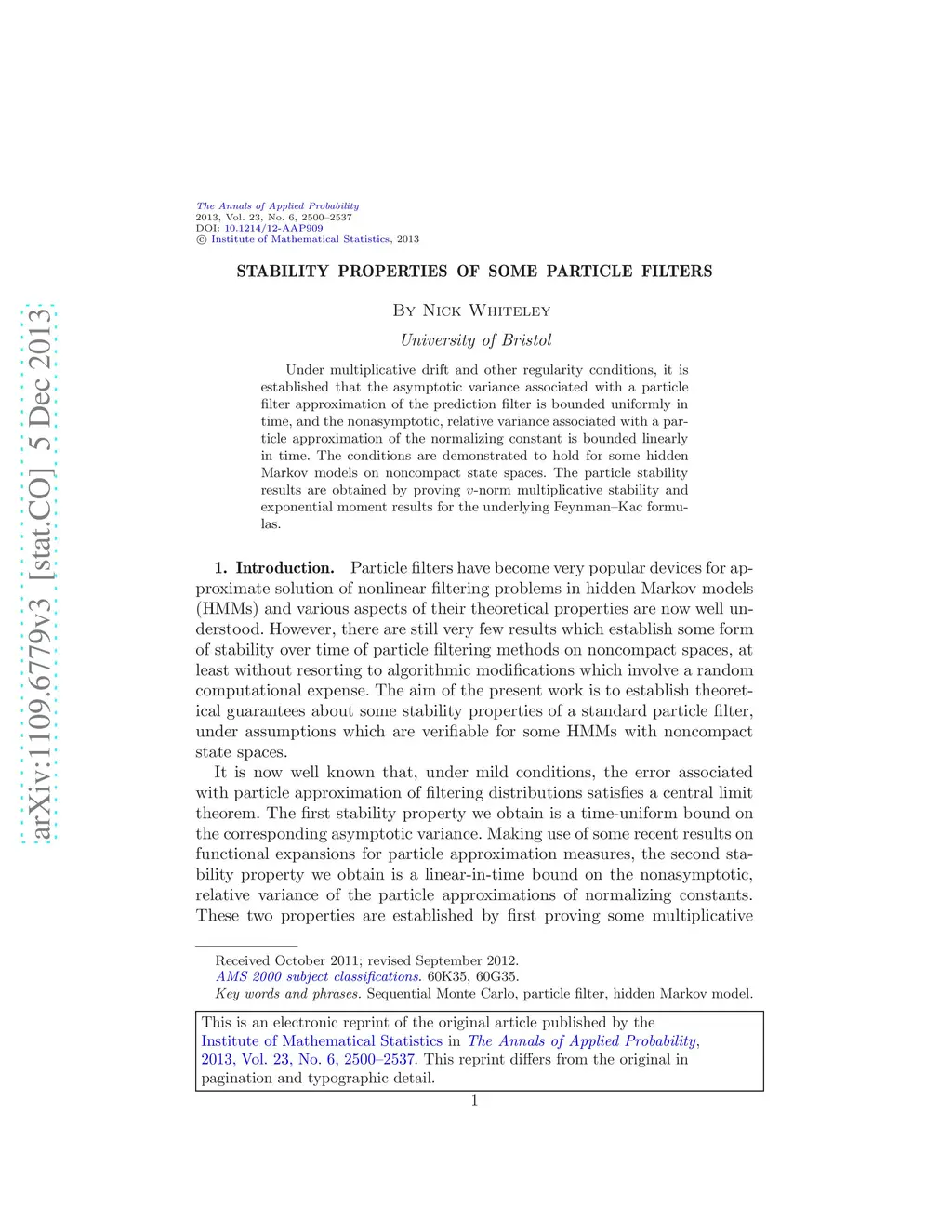 Under multiplicative drift and other regularity conditions, it is established that the asymptotic variance associated with a particle filter approximation of the prediction filter is bounded uniformly in time, and the nonasymptotic, relative variance associated with a particle approximation of the normalizing constant is bounded linearly in time. The conditions are demonstrated to hold for some hidden Markov models on noncompact state spaces. The particle stability results are obtained by proving -norm multiplicative stability and exponential moment results for the underlying Feynman-Kac formulas.
