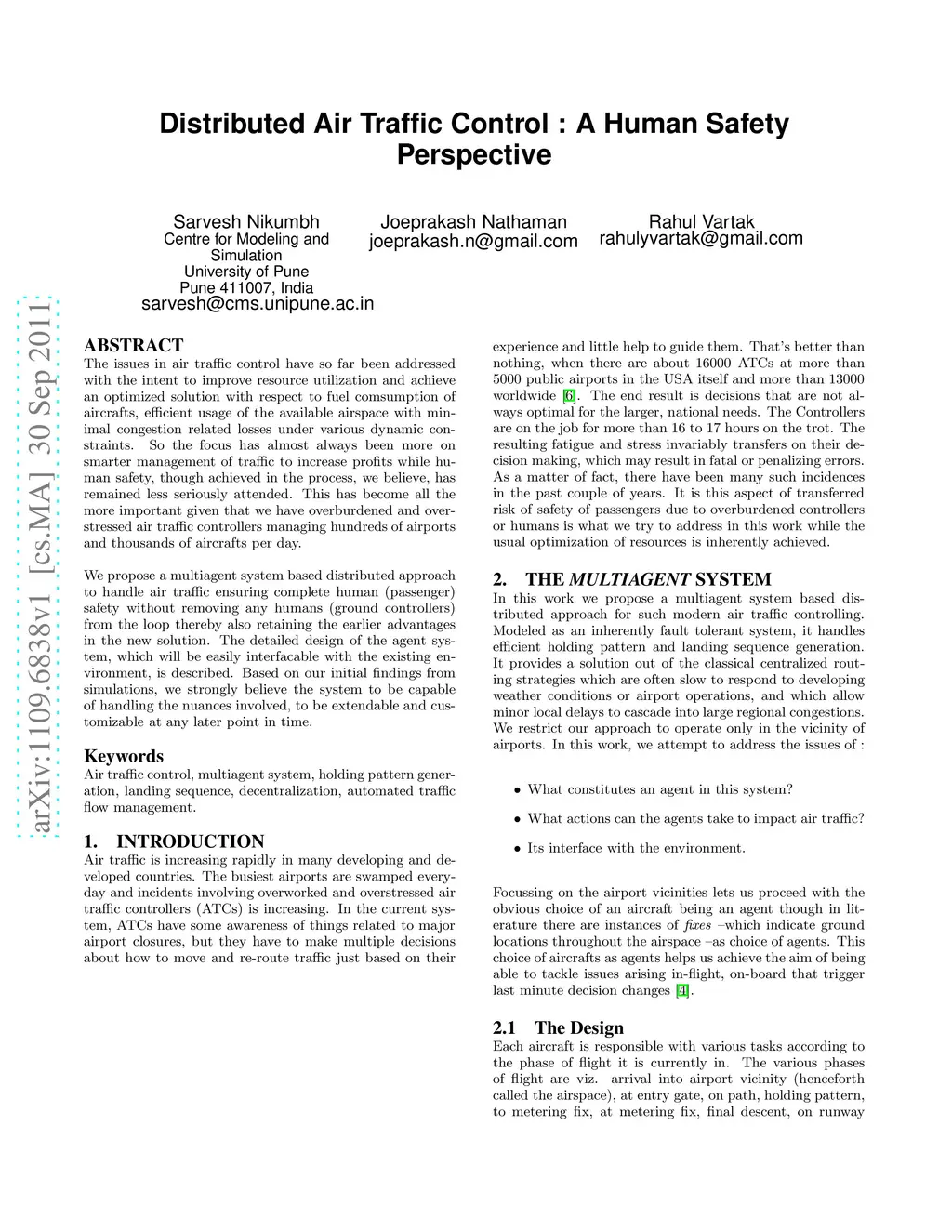The issues in air traffic control have so far been addressed with the intent to improve resource utilization and achieve an optimized solution with respect to fuel comsumption of aircrafts, efficient usage of the available airspace with minimal congestion related losses under various dynamic constraints. So the focus has almost always been more on smarter management of traffic to increase profits while human safety, though achieved in the process, we believe, has remained less seriously attended. This has become all the more important given that we have overburdened and overstressed air traffic controllers managing hundreds of airports and thousands of aircrafts per day. We propose a multiagent system based distributed approach to handle air traffic ensuring complete human (passenger) safety without removing any humans (ground controllers) from the loop thereby also retaining the earlier advantages in the new solution. The detailed design of the agent system, which will be easily interfacable with the existing environment, is described. Based on our initial findings from simulations, we strongly believe the system to be capable of handling the nuances involved, to be extendable and customizable at any later point in time.