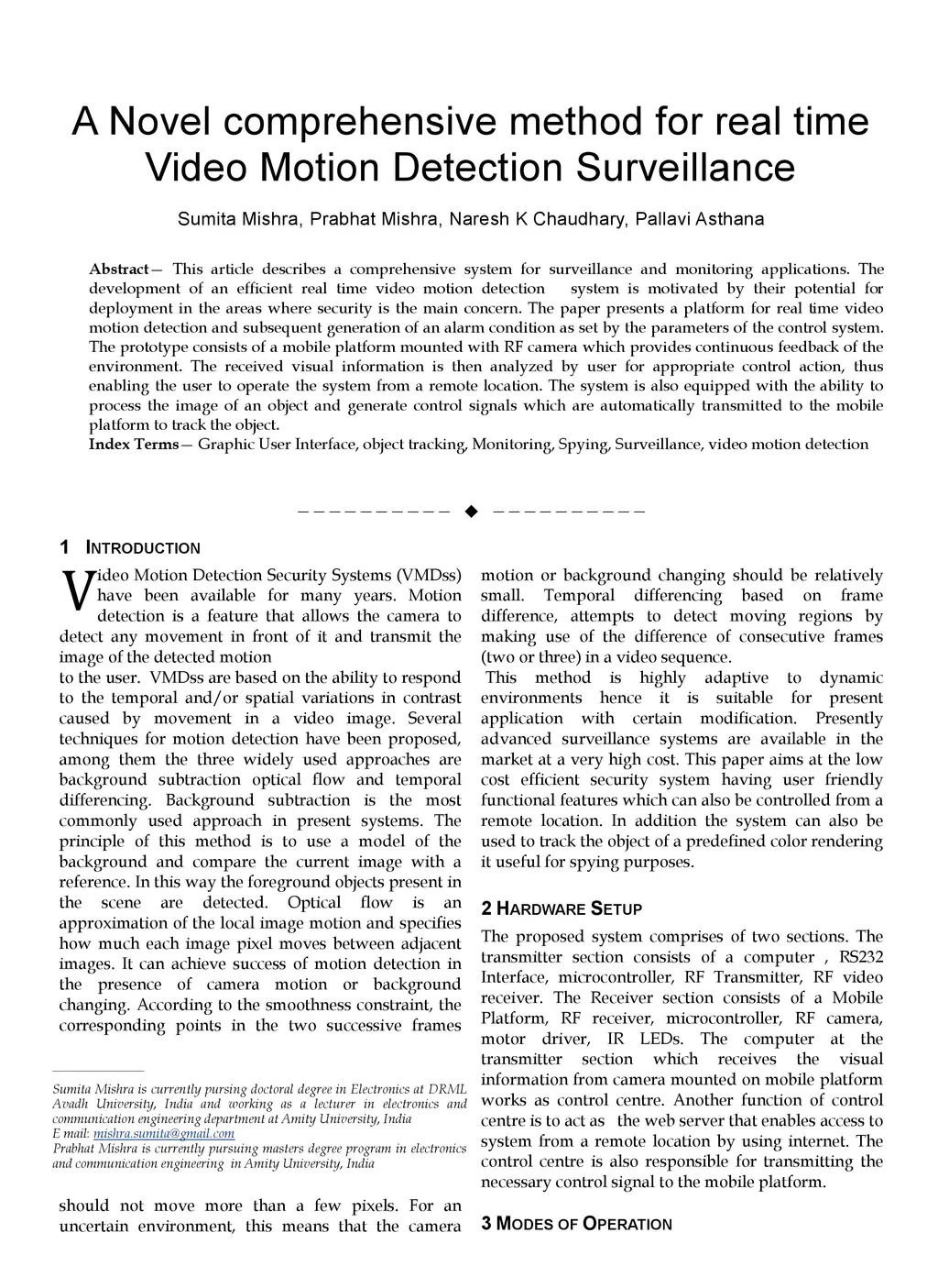 This article describes a comprehensive system for surveillance and monitoring applications. The development of an efficient real time video motion detection system is motivated by their potential for deployment in the areas where security is the main concern. The paper presents a platform for real time video motion detection and subsequent generation of an alarm condition as set by the parameters of the control system. The prototype consists of a mobile platform mounted with RF camera which provides continuous feedback of the environment. The received visual information is then analyzed by user for appropriate control action, thus enabling the user to operate the system from a remote location. The system is also equipped with the ability to process the image of an object and generate control signals which are automatically transmitted to the mobile platform to track the object.