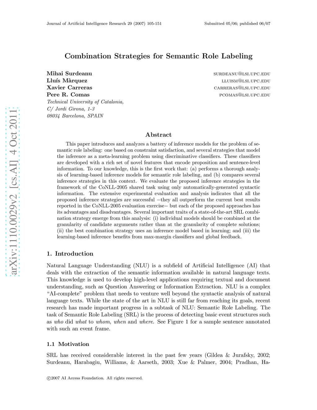 This paper introduces and analyzes a battery of inference models for the problem of semantic role labeling: one based on constraint satisfaction, and several strategies that model the inference as a meta-learning problem using discriminative classifiers. These classifiers are developed with a rich set of novel features that encode proposition and sentence-level information. To our knowledge, this is the first work that: (a) performs a thorough analysis of learning-based inference models for semantic role labeling, and (b) compares several inference strategies in this context. We evaluate the proposed inference strategies in the framework of the CoNLL-2005 shared task using only automatically-generated syntactic information. The extensive experimental evaluation and analysis indicates that all the proposed inference strategies are successful -they all outperform the current best results reported in the CoNLL-2005 evaluation exercise- but each of the proposed approaches has its advantages and disadvantages. Several important traits of a state-of-the-art SRL combination strategy emerge from this analysis: (i) individual models should be combined at the granularity of candidate arguments rather than at the granularity of complete solutions; (ii) the best combination strategy uses an inference model based in learning; and (iii) the learning-based inference benefits from max-margin classifiers and global feedback.