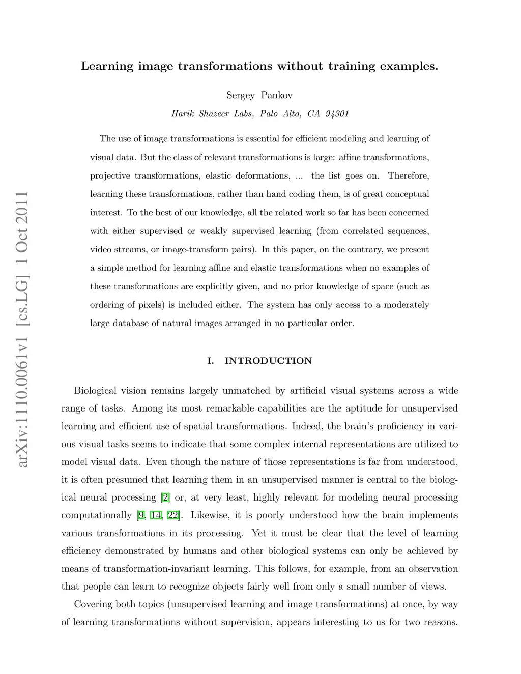 The use of image transformations is essential for efficient modeling and learning of visual data. But the class of relevant transformations is large: affine transformations, projective transformations, elastic deformations, ... the list goes on. Therefore, learning these transformations, rather than hand coding them, is of great conceptual interest. To the best of our knowledge, all the related work so far has been concerned with either supervised or weakly supervised learning (from correlated sequences, video streams, or image-transform pairs). In this paper, on the contrary, we present a simple method for learning affine and elastic transformations when no examples of these transformations are explicitly given, and no prior knowledge of space (such as ordering of pixels) is included either. The system has only access to a moderately large database of natural images arranged in no particular order.