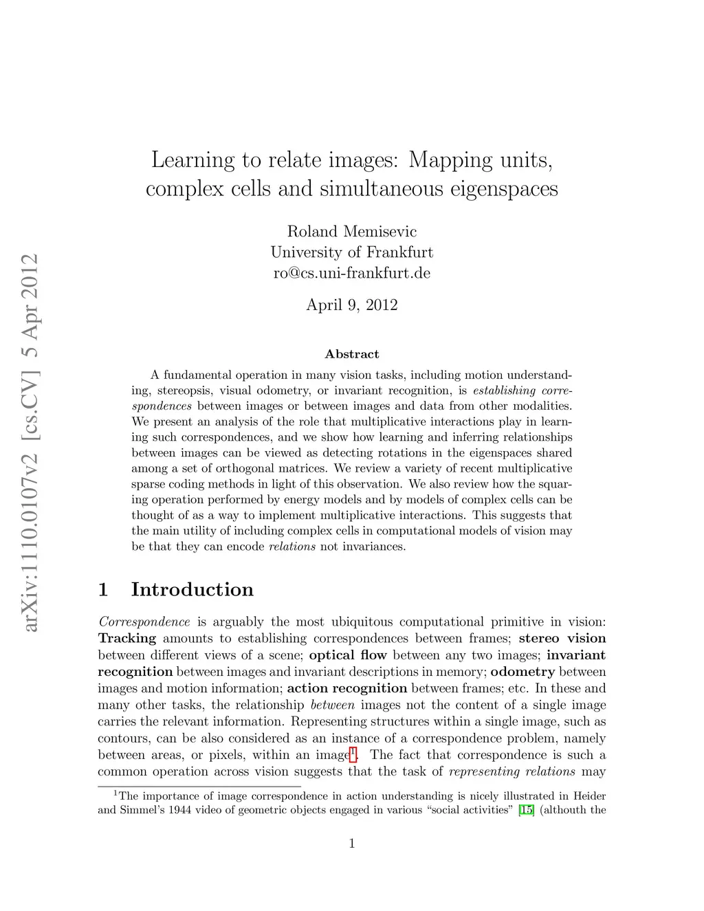 A fundamental operation in many vision tasks, including motion understanding, stereopsis, visual odometry, or invariant recognition, is establishing correspondences between images or between images and data from other modalities. We present an analysis of the role that multiplicative interactions play in learning such correspondences, and we show how learning and inferring relationships between images can be viewed as detecting rotations in the eigenspaces shared among a set of orthogonal matrices. We review a variety of recent multiplicative sparse coding methods in light of this observation. We also review how the squaring operation performed by energy models and by models of complex cells can be thought of as a way to implement multiplicative interactions. This suggests that the main utility of including complex cells in computational models of vision may be that they can encode relations not invariances.