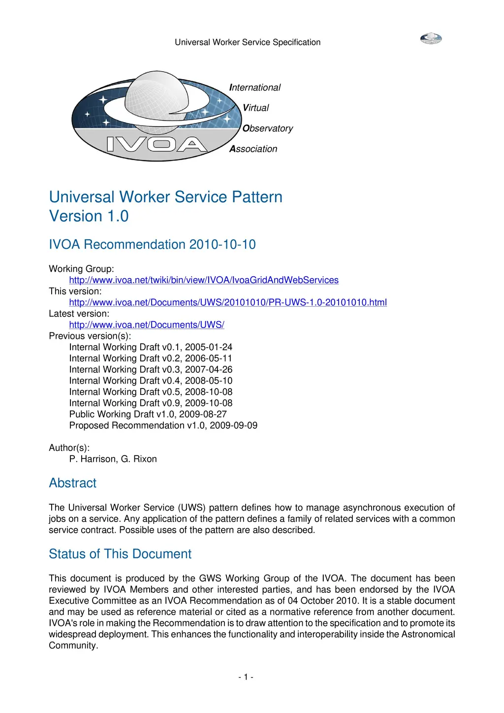 The Universal Worker Service (UWS) pattern defines how to manage asynchronous execution of jobs on a service. Any application of the pattern defines a family of related services with a common service contract. Possible uses of the pattern are also described.