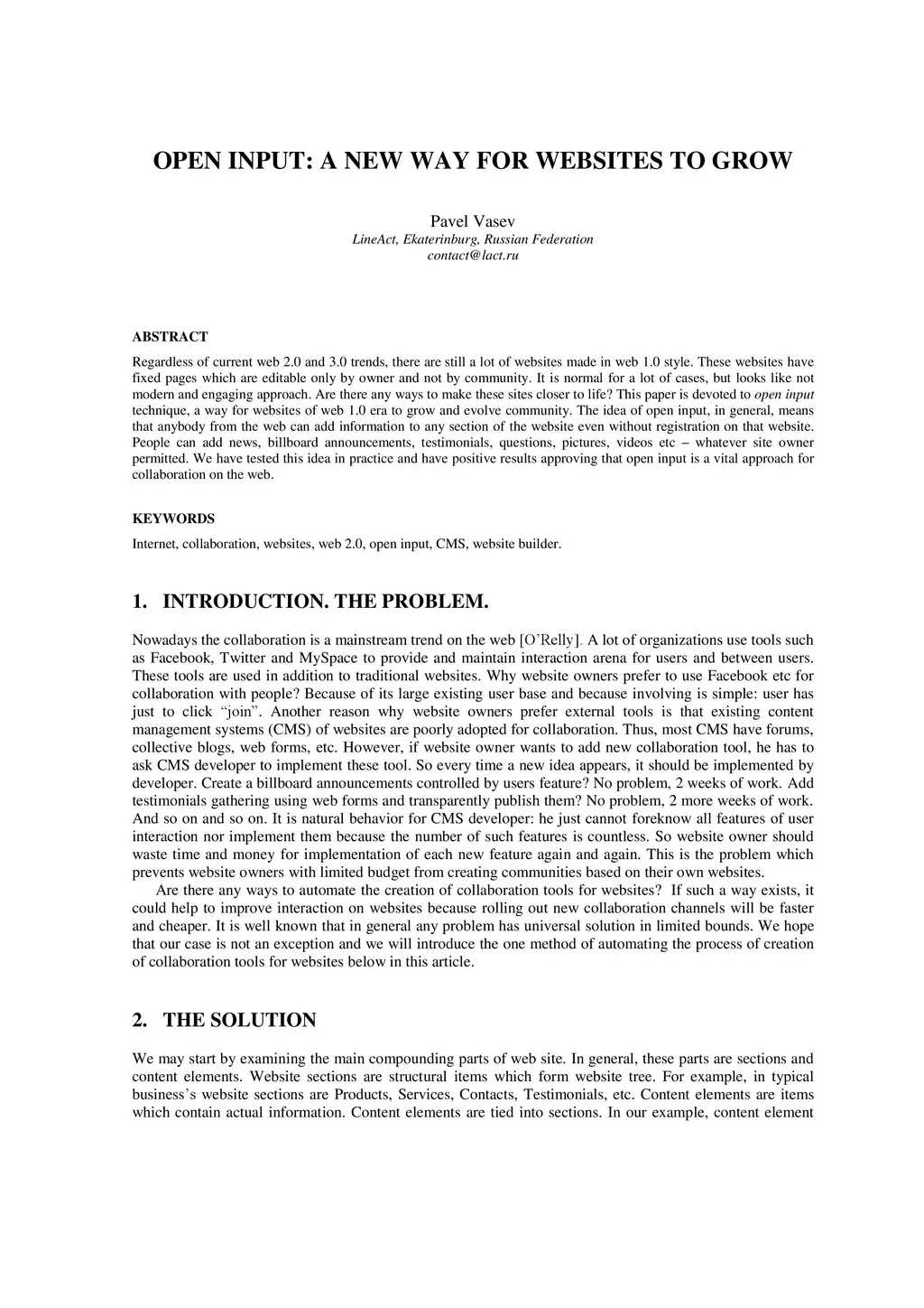 Regardless of current web 2.0 and 3.0 trends, there are still a lot of websites made in web 1.0 style. These websites have fixed pages which are editable only by owner and not by community. It is normal for a lot of cases, but looks like not modern and engaging approach. Are there any ways to make these sites closer to life? This paper is devoted to open input technique, a way for websites of web 1.0 era to grow and evolve community. The idea of open input, in general, means that anybody from the web can add information to any section of the website even without registration on that website. People can add news, billboard announcements, testimonials, questions, pictures, videos etc - whatever site owner permitted. We have tested this idea in practice and have positive results approving that open input is a vital approach for collaboration on the web.