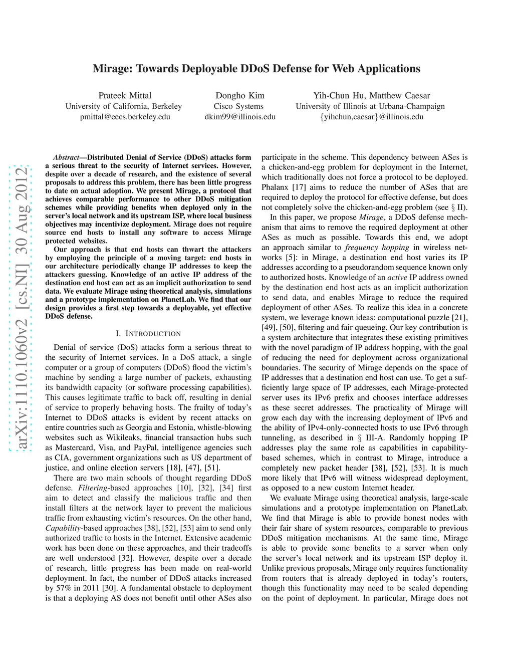 Distributed Denial of Service (DDoS) attacks form a serious threat to the security of Internet services. However, despite over a decade of research, and the existence of several proposals to address this problem, there has been little progress to date on actual adoption. We present Mirage, a protocol that achieves comparable performance to other DDoS mitigation schemes while providing benefits when deployed only in the server's local network and its upstream ISP, where local business objectives may incentivize deployment. Mirage does not require source end hosts to install any software to access Mirage protected websites. Unlike previous proposals, Mirage only requires functionality from routers that is already deployed in today's routers, though this functionality may need to be scaled depending on the point of deployment. Our approach is that end hosts can thwart the attackers by employing the principle of a moving target: end hosts in our architecture periodically change IP addresses to keep the attackers guessing. Knowledge of an active IP address of the destination end host can act as an implicit authorization to send data. We evaluate Mirage using theoretical analysis, simulations and a prototype implementation on PlanetLab. We find that our design provides a first step towards a deployable, yet effective DDoS defense.