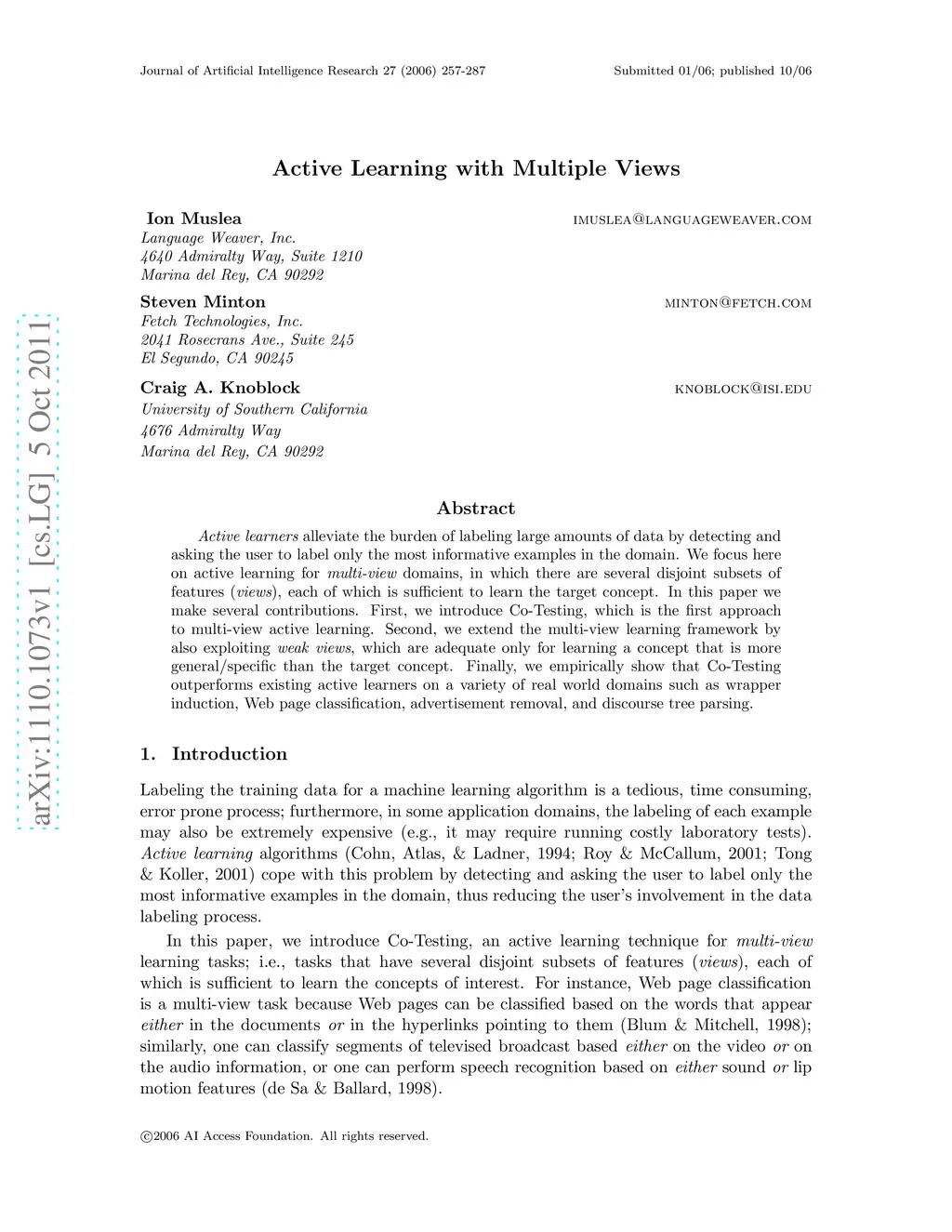 Active learners alleviate the burden of labeling large amounts of data by detecting and asking the user to label only the most informative examples in the domain. We focus here on active learning for multi-view domains, in which there are several disjoint subsets of features (views), each of which is sufficient to learn the target concept. In this paper we make several contributions. First, we introduce Co-Testing, which is the first approach to multi-view active learning. Second, we extend the multi-view learning framework by also exploiting weak views, which are adequate only for learning a concept that is more general/specific than the target concept. Finally, we empirically show that Co-Testing outperforms existing active learners on a variety of real world domains such as wrapper induction, Web page classification, advertisement removal, and discourse tree parsing.