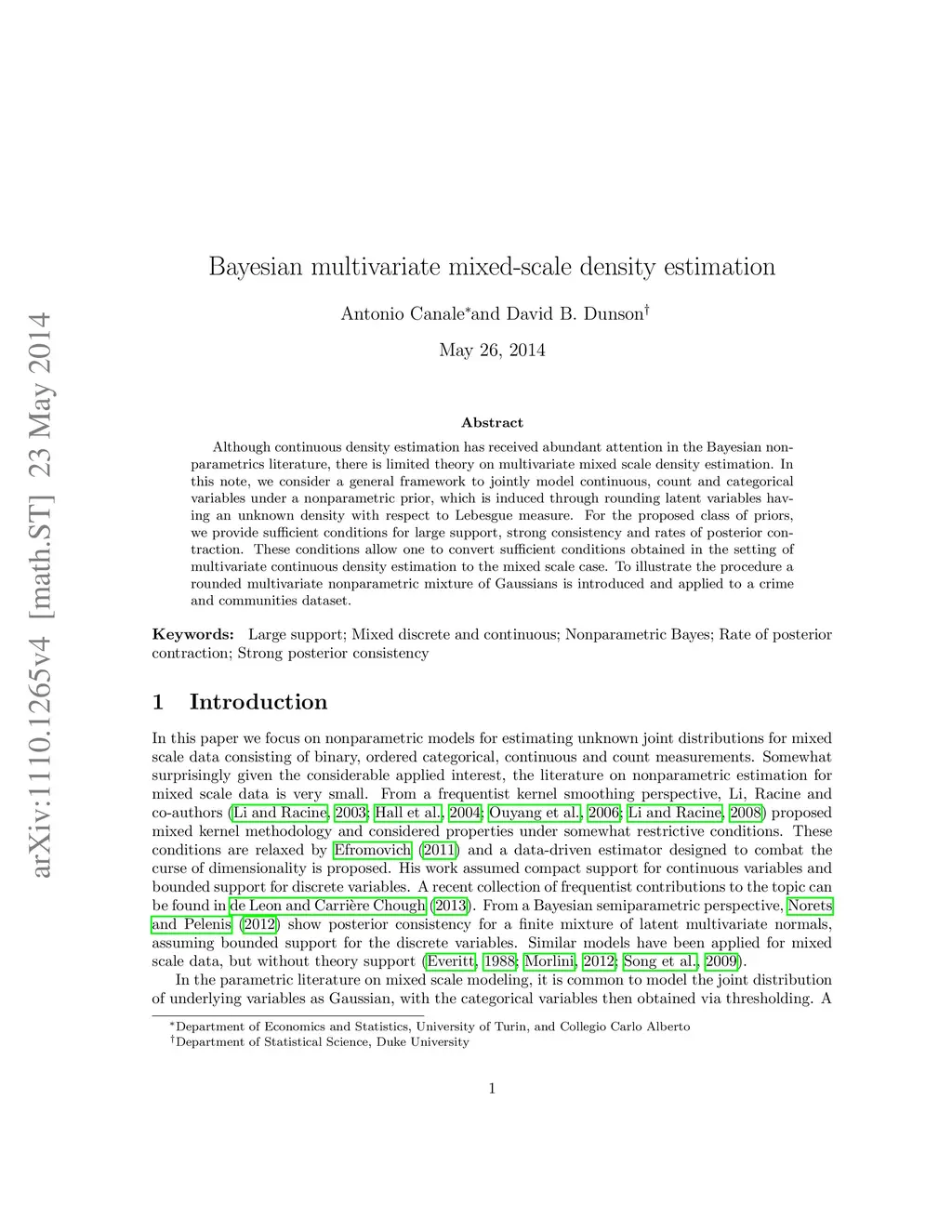 Although continuous density estimation has received abundant attention in the Bayesian nonparametrics literature, there is limited theory on multivariate mixed scale density estimation. In this note, we consider a general framework to jointly model continuous, count and categorical variables under a nonparametric prior, which is induced through rounding latent variables having an unknown density with respect to Lebesgue measure. For the proposed class of priors, we provide sufficient conditions for large support, strong consistency and rates of posterior contraction. These conditions allow one to convert sufficient conditions obtained in the setting of multivariate continuous density estimation to the mixed scale case. To illustrate the procedure a rounded multivariate nonparametric mixture of Gaussians is introduced and applied to a crime and communities dataset.