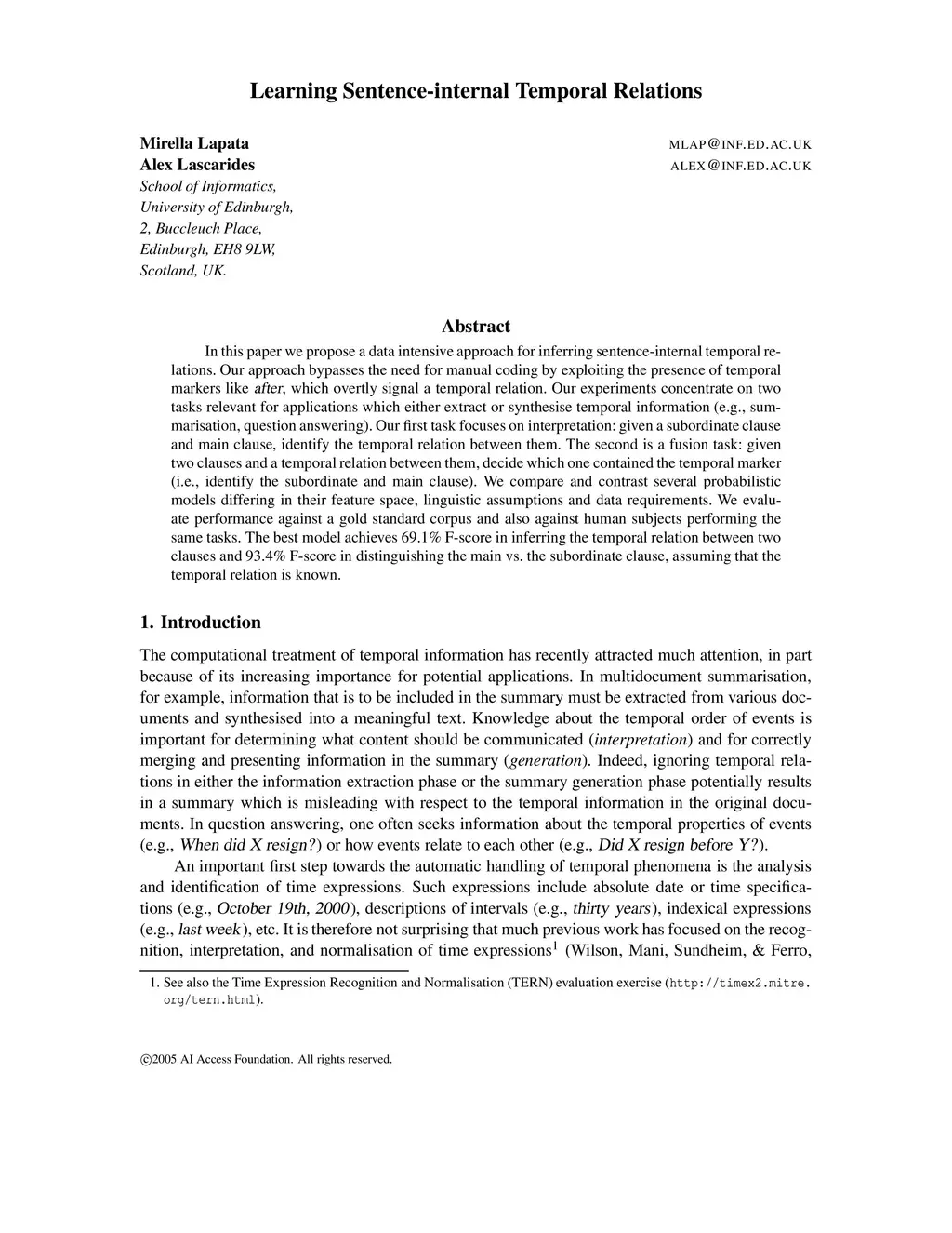In this paper we propose a data intensive approach for inferring sentence-internal temporal relations. Temporal inference is relevant for practical NLP applications which either extract or synthesize temporal information (e.g., summarisation, question answering). Our method bypasses the need for manual coding by exploiting the presence of markers like after", which overtly signal a temporal relation. We first show that models trained on main and subordinate clauses connected with a temporal marker achieve good performance on a pseudo-disambiguation task simulating temporal inference (during testing the temporal marker is treated as unseen and the models must select the right marker from a set of possible candidates). Secondly, we assess whether the proposed approach holds promise for the semi-automatic creation of temporal annotations. Specifically, we use a model trained on noisy and approximate data (i.e., main and subordinate clauses) to predict intra-sentential relations present in TimeBank, a corpus annotated rich temporal information. Our experiments compare and contrast several probabilistic models differing in their feature space, linguistic assumptions and data requirements. We evaluate performance against gold standard corpora and also against human subjects.