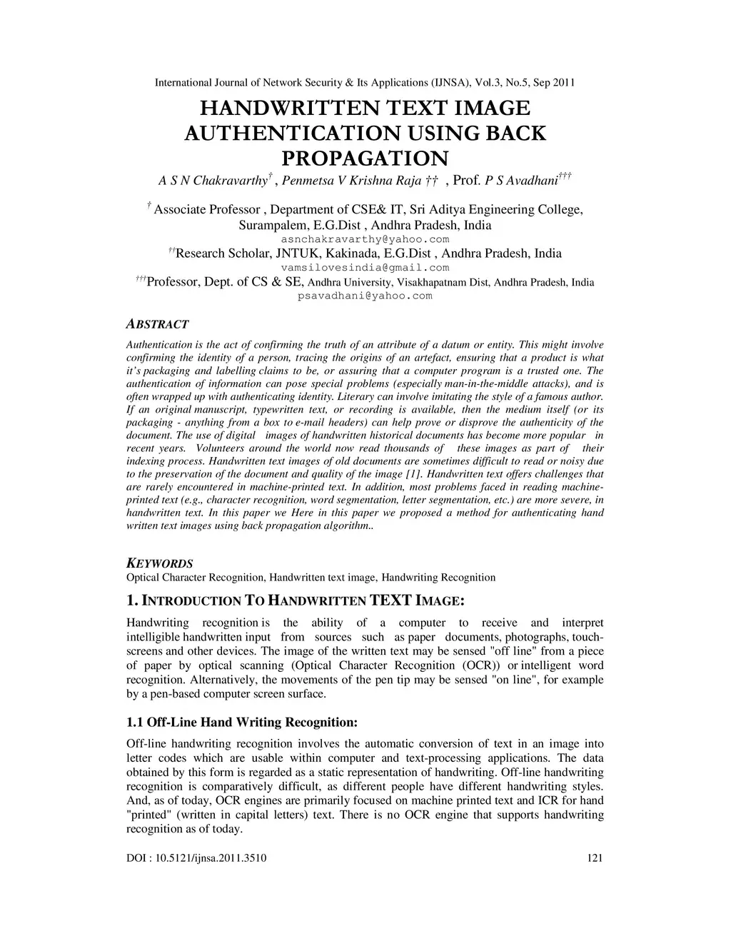 Authentication is the act of confirming the truth of an attribute of a datum or entity. This might involve confirming the identity of a person, tracing the origins of an artefact, ensuring that a product is what it's packaging and labelling claims to be, or assuring that a computer program is a trusted one. The authentication of information can pose special problems (especially man-in-the-middle attacks), and is often wrapped up with authenticating identity. Literary can involve imitating the style of a famous author. If an original manuscript, typewritten text, or recording is available, then the medium itself (or its packaging - anything from a box to e-mail headers) can help prove or disprove the authenticity of the document. The use of digital images of handwritten historical documents has become more popular in recent years. Volunteers around the world now read thousands of these images as part of their indexing process. Handwritten text images of old documents are sometimes difficult to read or noisy due to the preservation of the document and quality of the image [1]. Handwritten text offers challenges that are rarely encountered in machine-printed text. In addition, most problems faced in reading machine- printed text (e.g., character recognition, word segmentation, letter segmentation, etc.) are more severe, in handwritten text. In this paper we Here in this paper we proposed a method for authenticating hand written text images using back propagation algorithm..