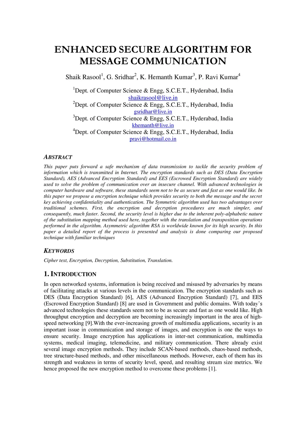 This paper puts forward a safe mechanism of data transmission to tackle the security problem of information which is transmitted in Internet. The encryption standards such as DES (Data Encryption Standard), AES (Advanced Encryption Standard) and EES (Escrowed Encryption Standard) are widely used to solve the problem of communication over an insecure channel. With advanced technologies in computer hardware and software, these standards seem not to be as secure and fast as one would like. In this paper we propose a encryption technique which provides security to both the message and the secret key achieving confidentiality and authentication. The Symmetric algorithm used has two advantages over traditional schemes. First, the encryption and decryption procedures are much simpler, and consequently, much faster. Second, the security level is higher due to the inherent poly-alphabetic nature of the substitution mapping method used here, together with the translation and transposition operations performed in the algorithm. Asymmetric algorithm RSA is worldwide known for its high security. In this paper a detailed report of the process is presented and analysis is done comparing our proposed technique with familiar techniques