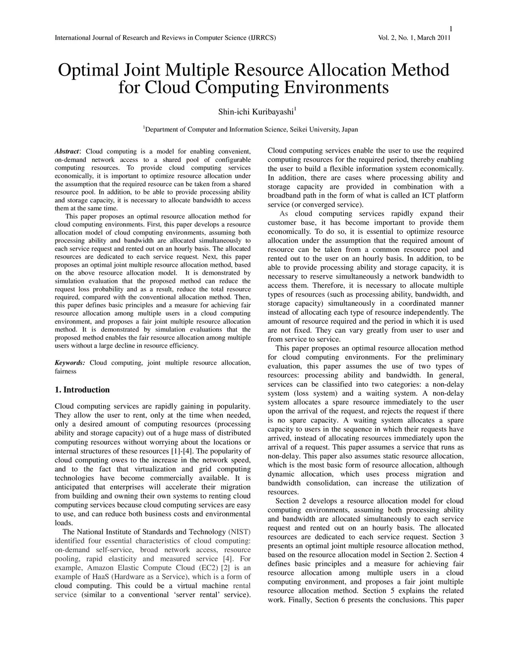 Cloud computing is a model for enabling convenient, on-demand network access to a shared pool of configurable computing resources. To provide cloud computing services economically, it is important to optimize resource allocation under the assumption that the required resource can be taken from a shared resource pool. In addition, to be able to provide processing ability and storage capacity, it is necessary to allocate bandwidth to access them at the same time. This paper proposes an optimal resource allocation method for cloud computing environments. First, this paper develops a resource allocation model of cloud computing environments, assuming both processing ability and bandwidth are allocated simultaneously to each service request and rented out on an hourly basis. The allocated resources are dedicated to each service request. Next, this paper proposes an optimal joint multiple resource allocation method, based on the above resource allocation model. It is demonstrated by simulation evaluation that the proposed method can reduce the request loss probability and as a result, reduce the total resource required, compared with the conventional allocation method. Then, this paper defines basic principles and a measure for achieving fair resource allocation among multiple users in a cloud computing environment, and proposes a fair joint multiple resource allocation method. It is demonstrated by simulation evaluations that the proposed method enables the fair resource allocation among multiple users without a large decline in resource efficiency. Keywords: Cloud computing, joint multiple resource allocation, fairness
