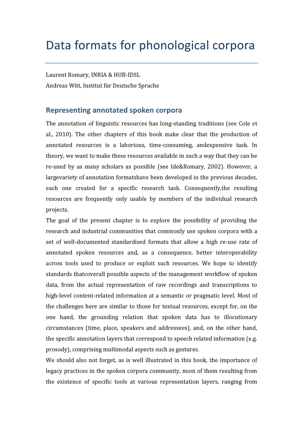 The goal of the present chapter is to explore the possibility of providing the research (but also the industrial) community that commonly uses spoken corpora with a stable portfolio of well-documented standardised formats that allow a high re-use rate of annotated spoken resources and, as a consequence, better interoperability across tools used to produce or exploit such resources.
