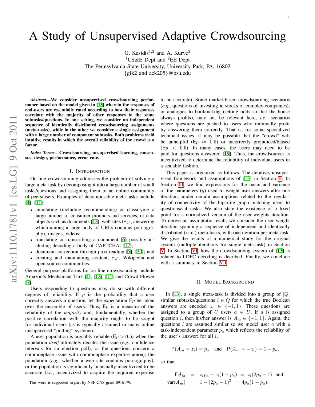 We consider unsupervised crowdsourcing performance based on the model wherein the responses of end-users are essentially rated according to how their responses correlate with the majority of other responses to the same subtasks/questions. In one setting, we consider an independent sequence of identically distributed crowdsourcing assignments (meta-tasks), while in the other we consider a single assignment with a large number of component subtasks. Both problems yield intuitive results in which the overall reliability of the crowd is a factor.