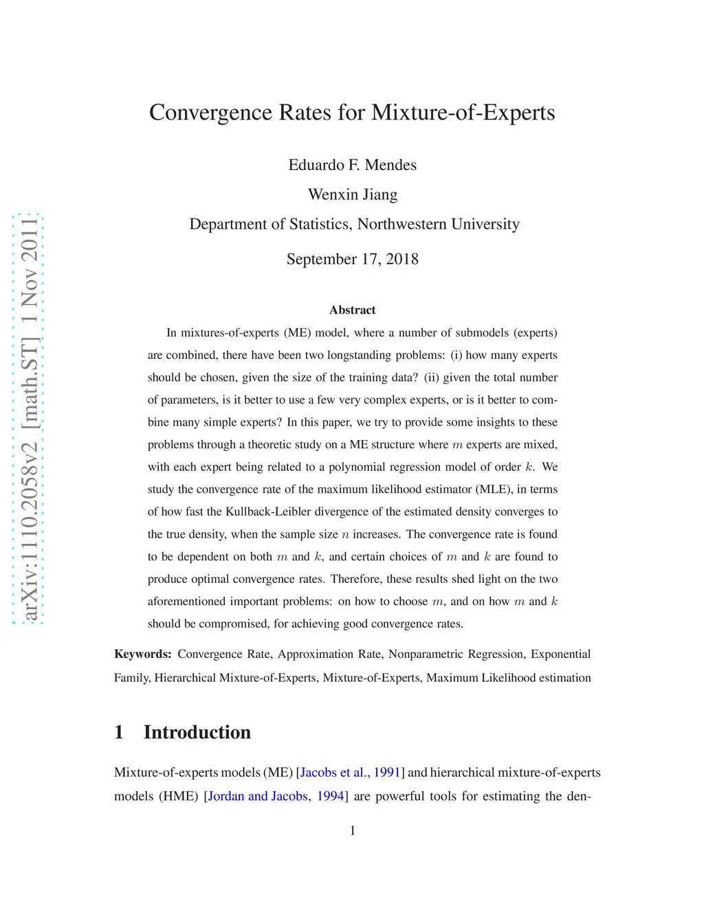 In mixtures-of-experts (ME) model, where a number of submodels (experts) are combined, there have been two longstanding problems: (i) how many experts should be chosen, given the size of the training data? (ii) given the total number of parameters, is it better to use a few very complex experts, or is it better to combine many simple experts? In this paper, we try to provide some insights to these problems through a theoretic study on a ME structure where experts are mixed, with each expert being related to a polynomial regression model of order . We study the convergence rate of the maximum likelihood estimator (MLE), in terms of how fast the Kullback-Leibler divergence of the estimated density converges to the true density, when the sample size increases. The convergence rate is found to be dependent on both and , and certain choices of and are found to produce optimal convergence rates. Therefore, these results shed light on the two aforementioned important problems: on how to choose , and on how and should be compromised, for achieving good convergence rates.