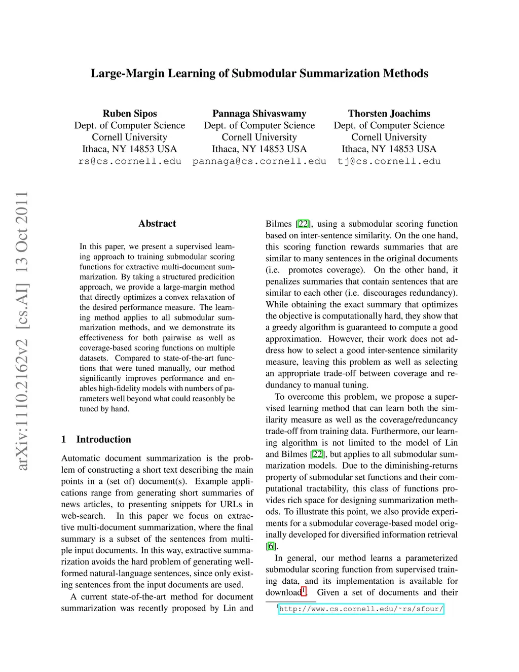 Large-Margin Learning of Submodular Summarization Methods