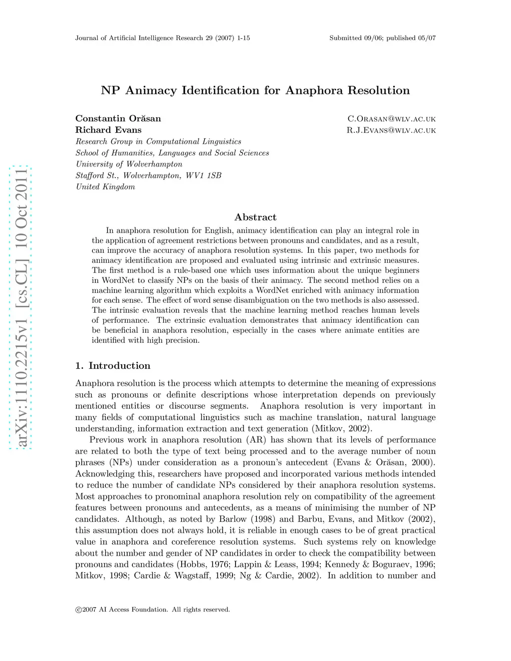 NP Animacy Identification for Anaphora Resolution