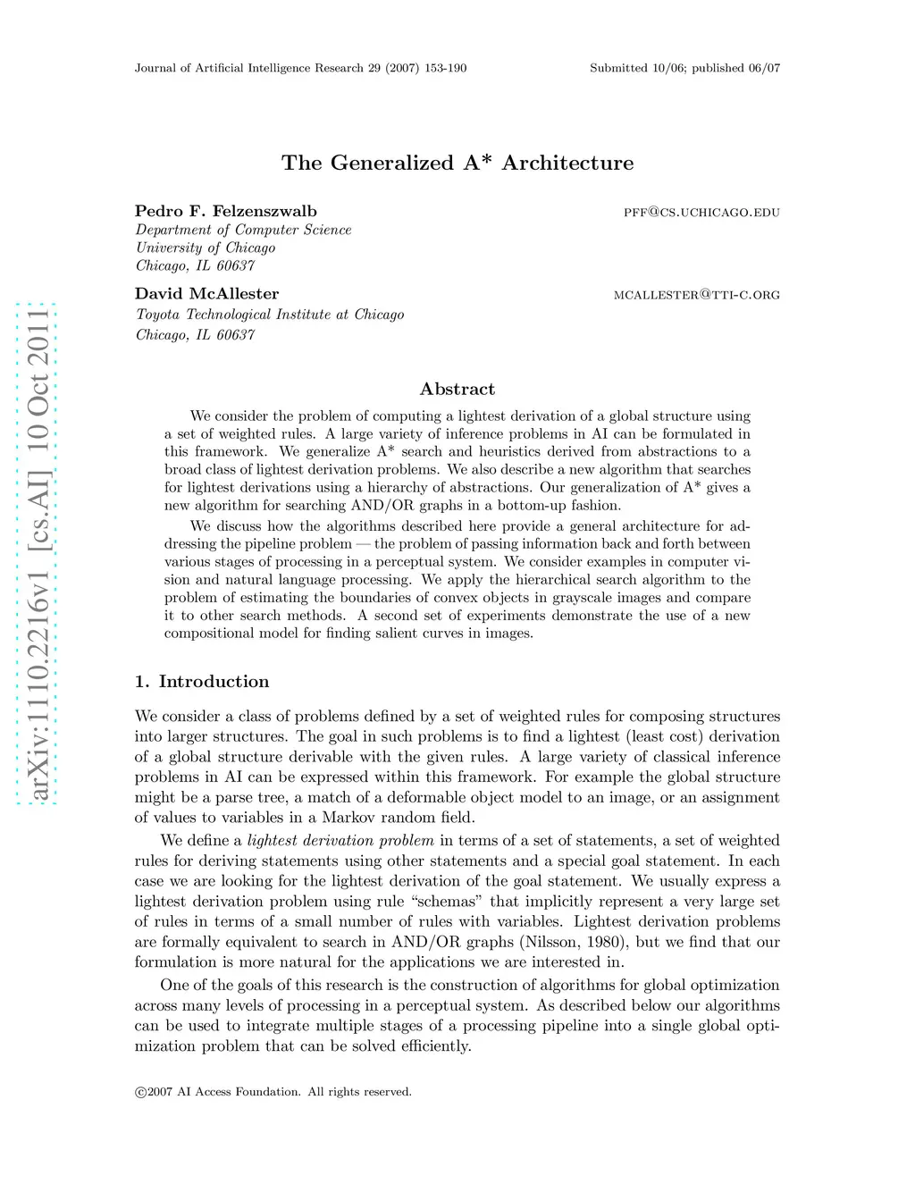 We consider the problem of computing a lightest derivation of a global structure using a set of weighted rules. A large variety of inference problems in AI can be formulated in this framework. We generalize A* search and heuristics derived from abstractions to a broad class of lightest derivation problems. We also describe a new algorithm that searches for lightest derivations using a hierarchy of abstractions. Our generalization of A* gives a new algorithm for searching AND/OR graphs in a bottom-up fashion. We discuss how the algorithms described here provide a general architecture for addressing the pipeline problem --- the problem of passing information back and forth between various stages of processing in a perceptual system. We consider examples in computer vision and natural language processing. We apply the hierarchical search algorithm to the problem of estimating the boundaries of convex objects in grayscale images and compare it to other search methods. A second set of experiments demonstrate the use of a new compositional model for finding salient curves in images.