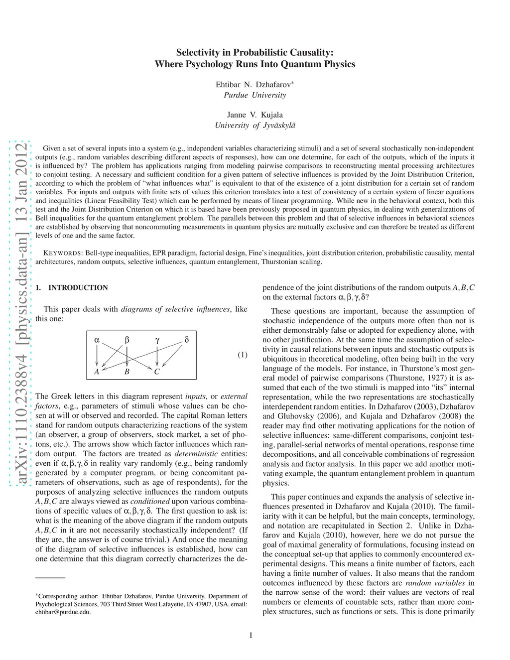 Given a set of several inputs into a system (e.g., independent variables characterizing stimuli) and a set of several stochastically non-independent outputs (e.g., random variables describing different aspects of responses), how can one determine, for each of the outputs, which of the inputs it is influenced by? The problem has applications ranging from modeling pairwise comparisons to reconstructing mental processing architectures to conjoint testing. A necessary and sufficient condition for a given pattern of selective influences is provided by the Joint Distribution Criterion, according to which the problem of "what influences what" is equivalent to that of the existence of a joint distribution for a certain set of random variables. For inputs and outputs with finite sets of values this criterion translates into a test of consistency of a certain system of linear equations and inequalities (Linear Feasibility Test) which can be performed by means of linear programming. While new in the behavioral context, both this test and the Joint Distribution Criterion on which it is based have been previously proposed in quantum physics, in dealing with generalizations of Bell inequalities for the quantum entanglement problem. The parallels between this problem and that of selective influences in behavioral sciences is established by observing that noncommuting measurements in quantum physics are mutually exclusive and can therefore be treated as different levels of one and the same factor.