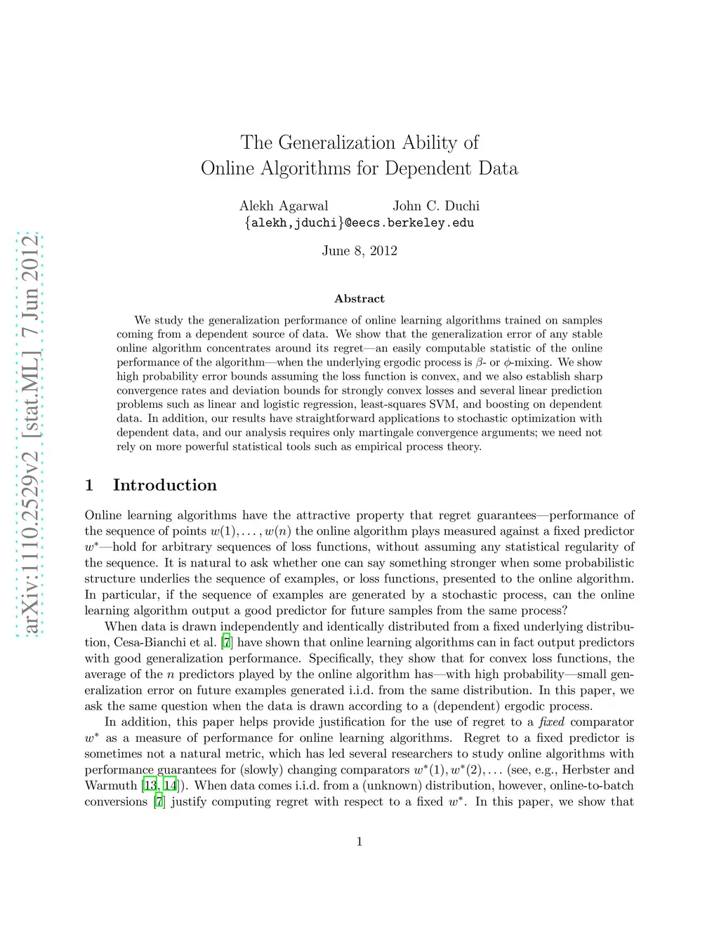 We study the generalization performance of online learning algorithms trained on samples coming from a dependent source of data. We show that the generalization error of any stable online algorithm concentrates around its regret--an easily computable statistic of the online performance of the algorithm--when the underlying ergodic process is - or -mixing. We show high probability error bounds assuming the loss function is convex, and we also establish sharp convergence rates and deviation bounds for strongly convex losses and several linear prediction problems such as linear and logistic regression, least-squares SVM, and boosting on dependent data. In addition, our results have straightforward applications to stochastic optimization with dependent data, and our analysis requires only martingale convergence arguments; we need not rely on more powerful statistical tools such as empirical process theory.