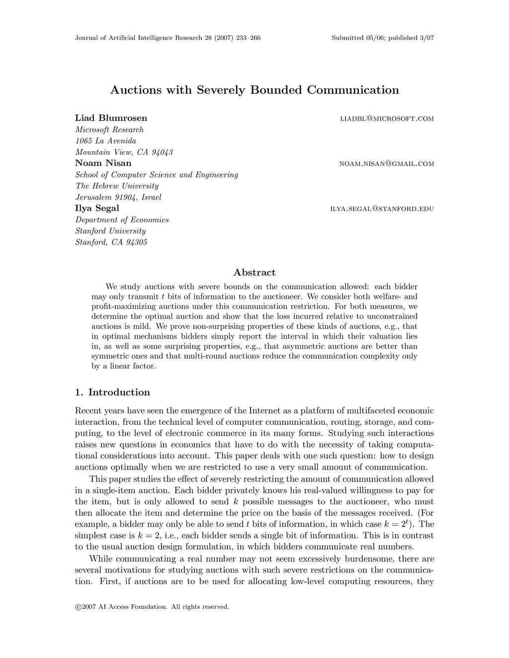 We study auctions with severe bounds on the communication allowed: each bidder may only transmit t bits of information to the auctioneer. We consider both welfare- and profit-maximizing auctions under this communication restriction. For both measures, we determine the optimal auction and show that the loss incurred relative to unconstrained auctions is mild. We prove non-surprising properties of these kinds of auctions, e.g., that in optimal mechanisms bidders simply report the interval in which their valuation lies in, as well as some surprising properties, e.g., that asymmetric auctions are better than symmetric ones and that multi-round auctions reduce the communication complexity only by a linear factor.