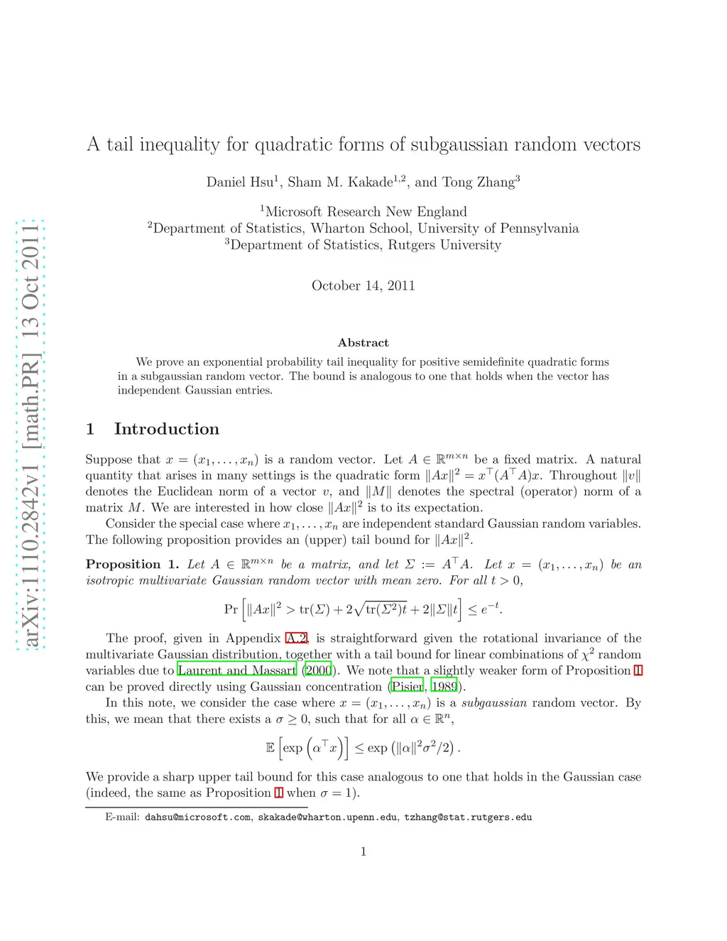 We prove an exponential probability tail inequality for positive semidefinite quadratic forms in a subgaussian random vector. The bound is analogous to one that holds when the vector has independent Gaussian entries.