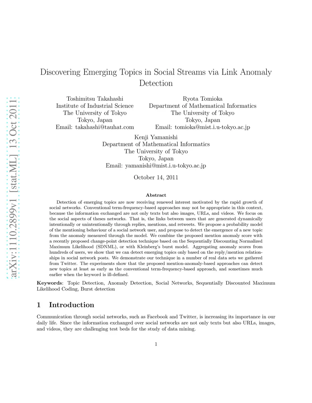 Discovering Emerging Topics in Social Streams via Link Anomaly Detection