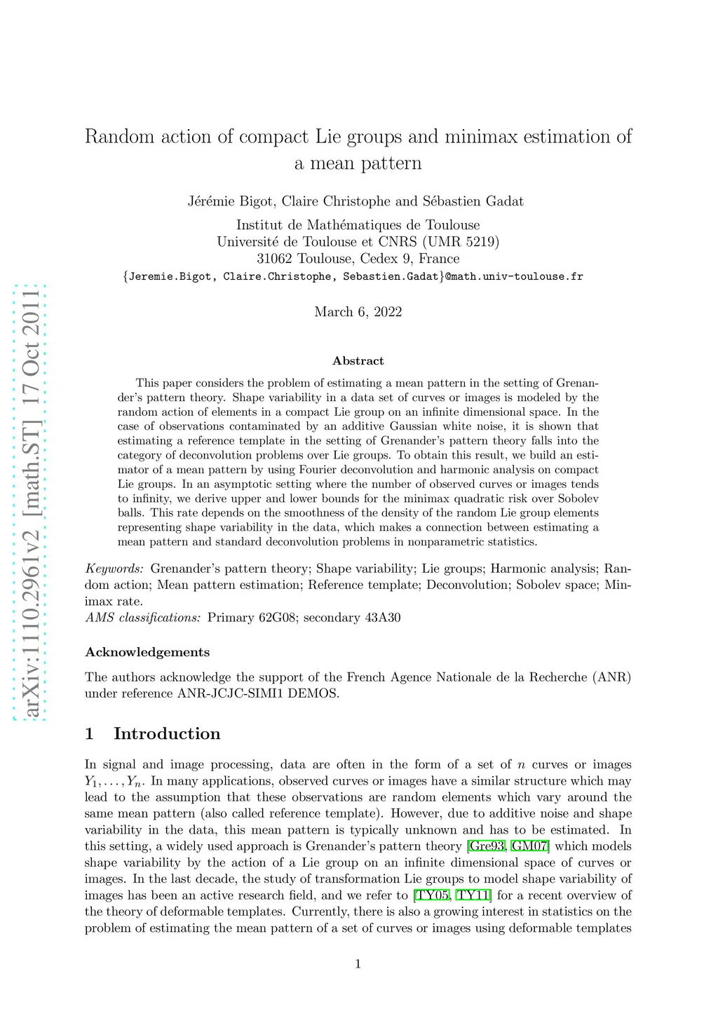 This paper considers the problem of estimating a mean pattern in the setting of Grenander's pattern theory. Shape variability in a data set of curves or images is modeled by the random action of elements in a compact Lie group on an infinite dimensional space. In the case of observations contaminated by an additive Gaussian white noise, it is shown that estimating a reference template in the setting of Grenander's pattern theory falls into the category of deconvolution problems over Lie groups. To obtain this result, we build an estimator of a mean pattern by using Fourier deconvolution and harmonic analysis on compact Lie groups. In an asymptotic setting where the number of observed curves or images tends to infinity, we derive upper and lower bounds for the minimax quadratic risk over Sobolev balls. This rate depends on the smoothness of the density of the random Lie group elements representing shape variability in the data, which makes a connection between estimating a mean pattern and standard deconvolution problems in nonparametric statistics.