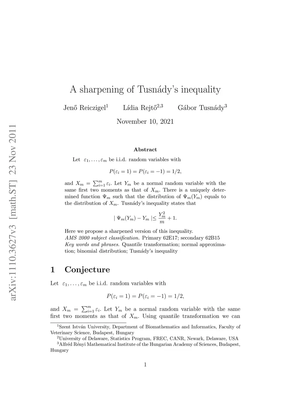 Let ~ be i.i.d. random variables with and Let $Y_m $ be a normal random variable with the same first two moments as that of There is a uniquely determined function such that the distribution of equals to the distribution of . Tusn\ády's inequality states that Here we propose a sharpened version of this inequality.