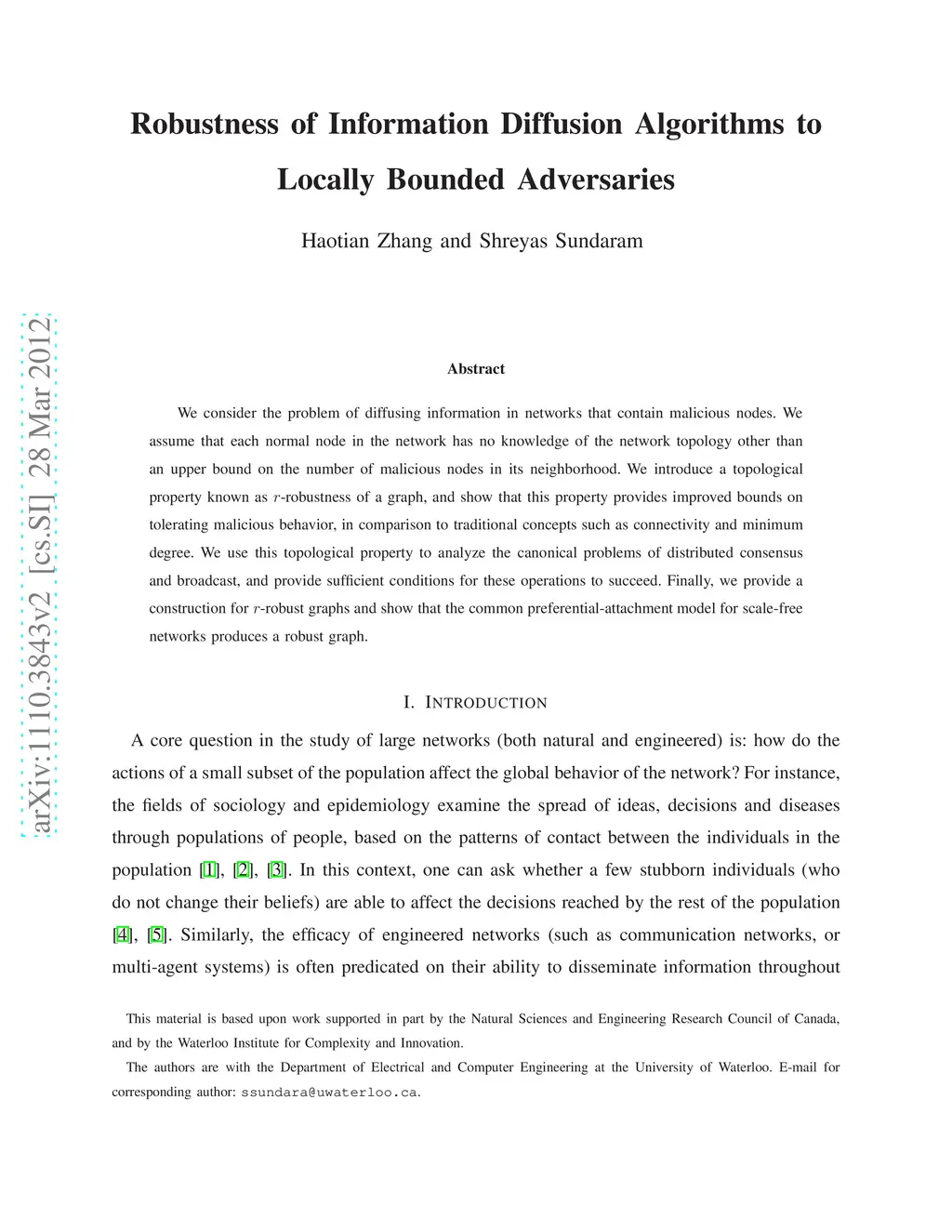We consider the problem of diffusing information in networks that contain malicious nodes. We assume that each normal node in the network has no knowledge of the network topology other than an upper bound on the number of malicious nodes in its neighborhood. We introduce a topological property known as r-robustness of a graph, and show that this property provides improved bounds on tolerating malicious behavior, in comparison to traditional concepts such as connectivity and minimum degree. We use this topological property to analyze the canonical problems of distributed consensus and broadcasting, and provide sufficient conditions for these operations to succeed. Finally, we provide a construction for r-robust graphs and show that the common preferential-attachment model for scale-free networks produces a robust graph.