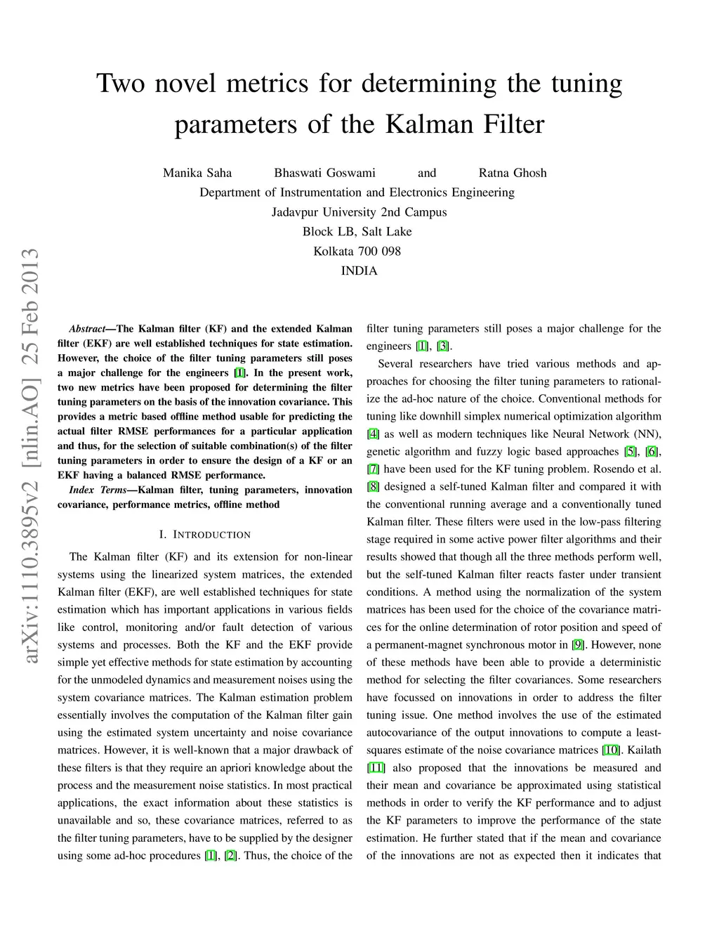 The Kalman filter (KF) and the extended Kalman filter (EKF) are well established techniques for state estimation. However, the choice of the filter tuning parameters still poses a major challenge for the engineers [1]. In the present work, two new costs have been proposed for determining the filter tuning parameters on the basis of the innovation covariance. This provides a cost function based method for the selection of suitable combination(s) of filter tuning parameters in order to ensure the design of a KF or an EKF having an optimally balanced RMSE performance. Index Terms-Kalman filter, tuning parameters, innovation covariance, cost function