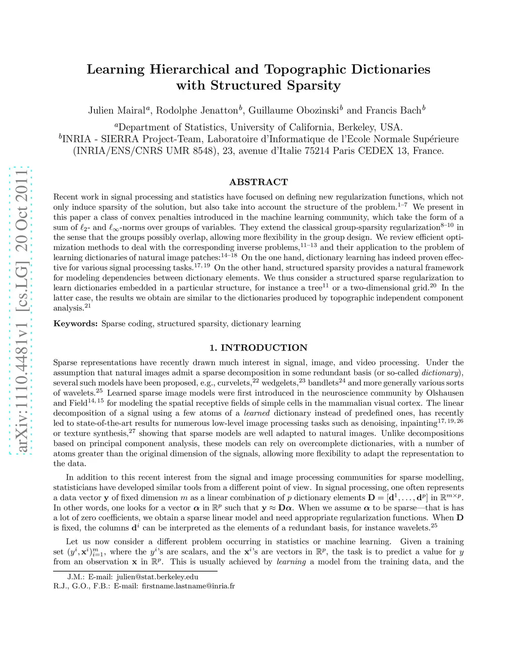 Recent work in signal processing and statistics have focused on defining new regularization functions, which not only induce sparsity of the solution, but also take into account the structure of the problem. We present in this paper a class of convex penalties introduced in the machine learning community, which take the form of a sum of l_2 and l_infinity-norms over groups of variables. They extend the classical group-sparsity regularization in the sense that the groups possibly overlap, allowing more flexibility in the group design. We review efficient optimization methods to deal with the corresponding inverse problems, and their application to the problem of learning dictionaries of natural image patches: On the one hand, dictionary learning has indeed proven effective for various signal processing tasks. On the other hand, structured sparsity provides a natural framework for modeling dependencies between dictionary elements. We thus consider a structured sparse regularization to learn dictionaries embedded in a particular structure, for instance a tree or a two-dimensional grid. In the latter case, the results we obtain are similar to the dictionaries produced by topographic independent component analysis.